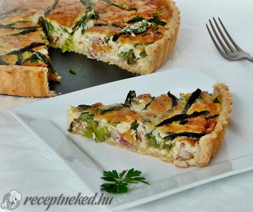 A lehűlt tésztát nyújtsuk ki vékonyra és helyezzük bele egy kivajazott piteformába. Osszuk el egyenletesen rajta a lehűlt bacon kockákat, a lecsepegtetett spárgát és reszeljünk rá sajtot, végül pedig óvatosan öntsük rá a tojásos keveréket.