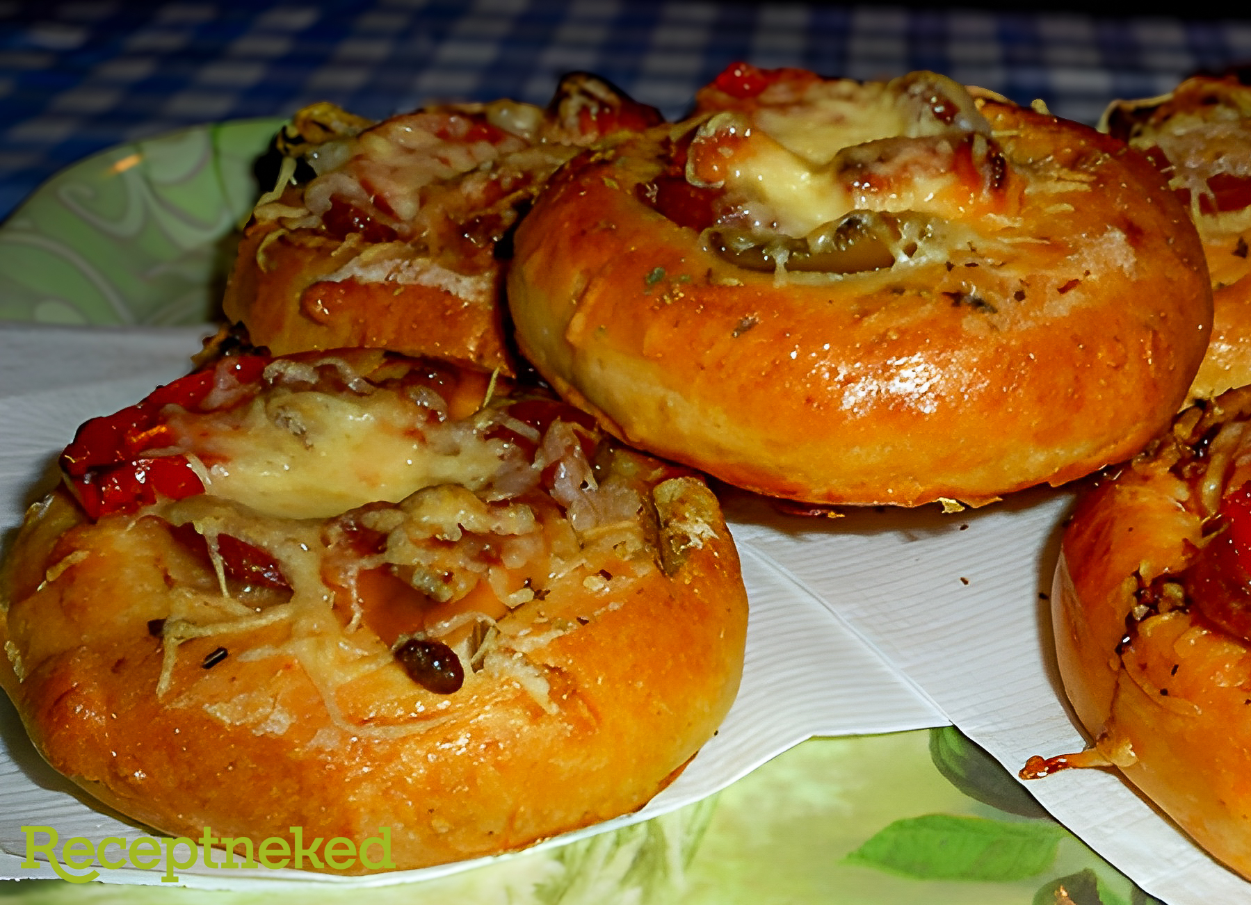 A pogácsák „fészkébe” először reszelt sajtot teszünk, majd a többi hozzávalót elosztjuk rajta. A tészta széleit felvert tojással lekenjük, és oregánóval megszórjuk.