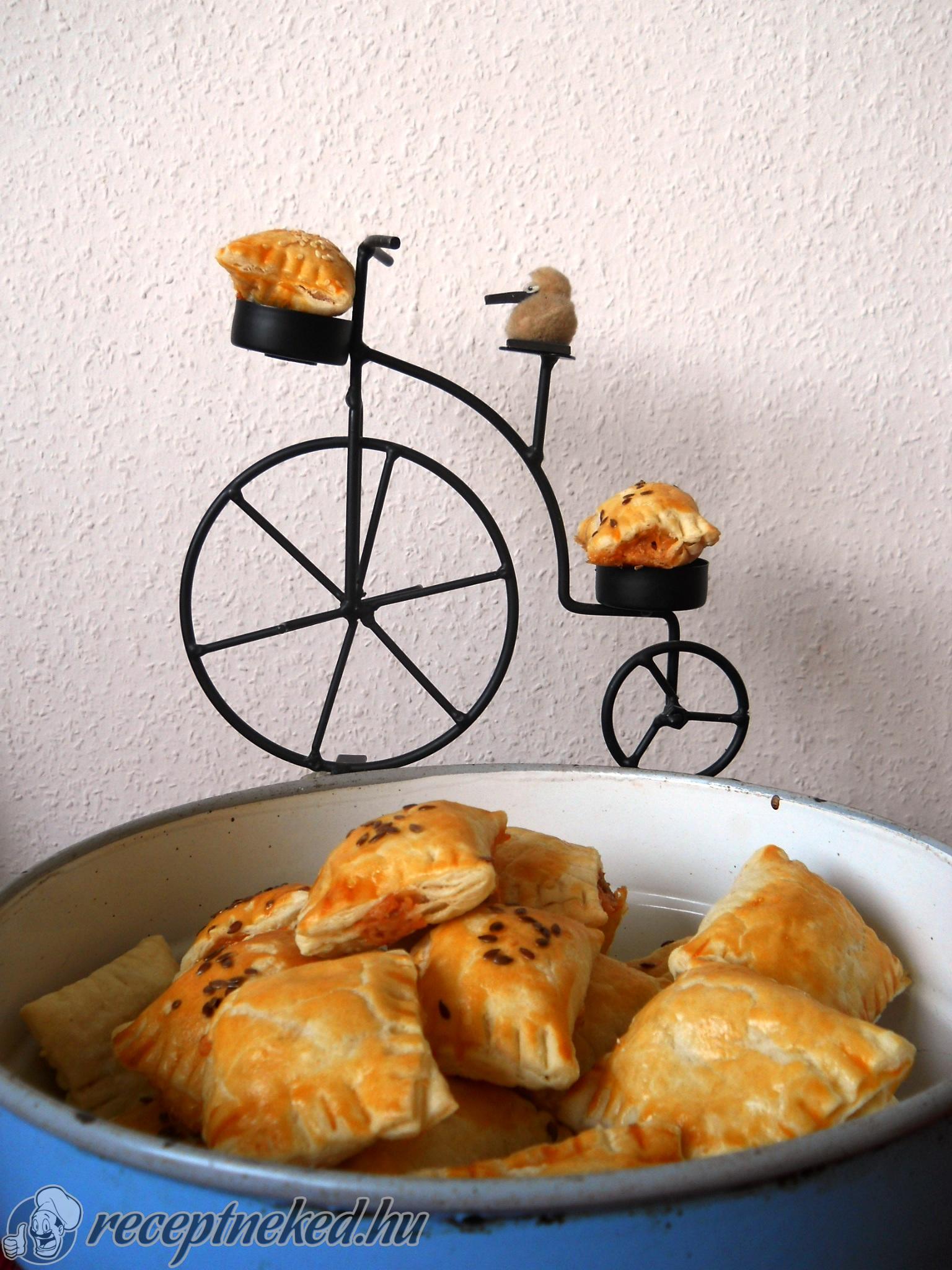 A leveles tésztát lisztezett felületen kb. 2-3 mm vastagságúra nyújtjuk, majd téglalapokra vágjuk. A téglalapok egyik felére halmozzuk a tonhalas tölteléket. A széleket megkenjük felvert tojással, majd a tészta másik felét ráhajtjuk. A széleket alaposan lenyomkodjuk, villával is rögzítjük, hogy sütés közben ne nyíljanak szét.