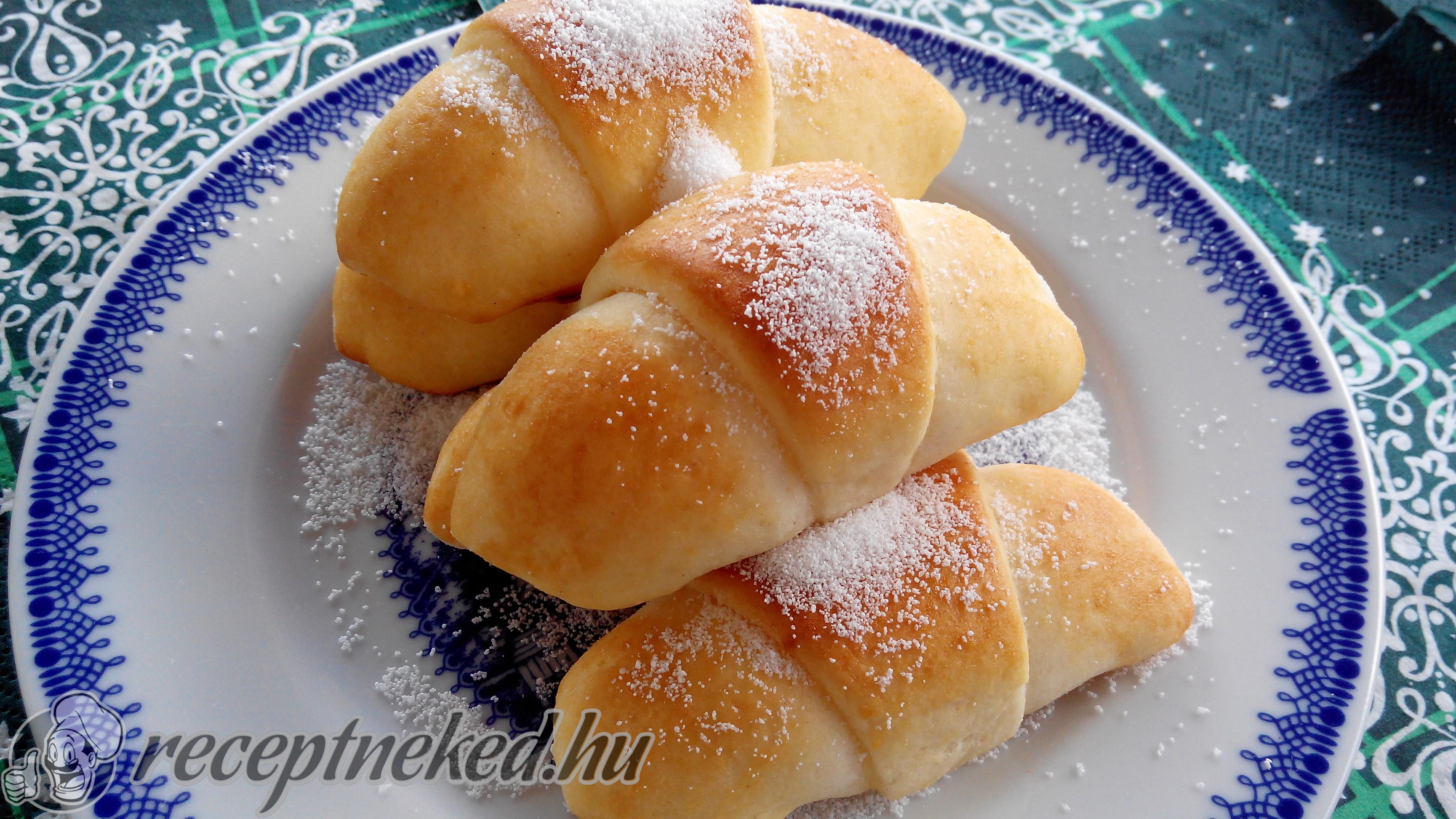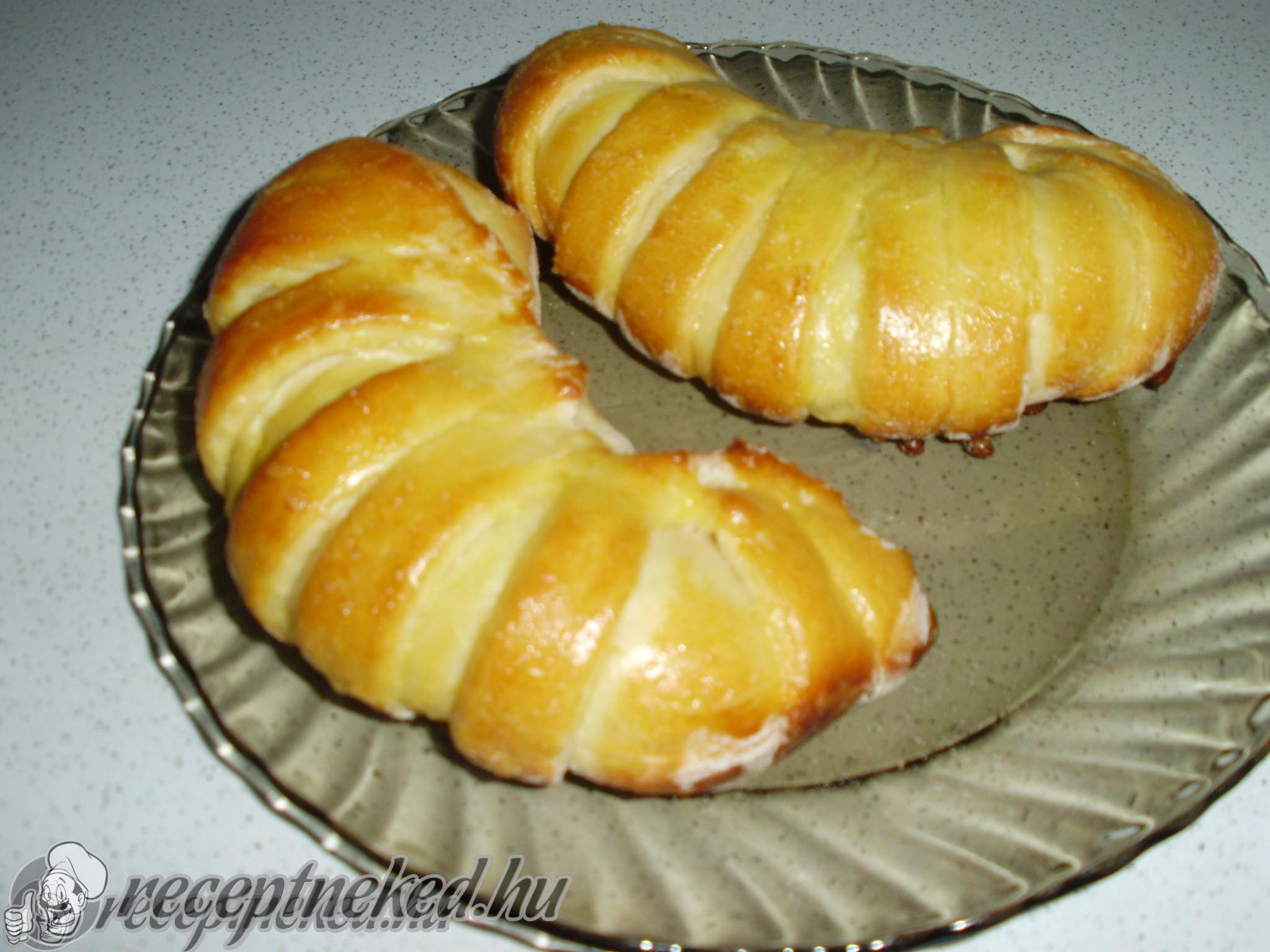 A kész tésztát 4 egyenlő részre osztjuk. A cipókat egyenként vékonyra, kör alakúra nyújtjuk és megkenjük felvert tojással. 16 részre vágjuk és megszórjuk kevés sajttal, majd a részeket egyenként feltekerjük a szélesebbik felétől kezdve és tepsire sorakozatjuk.