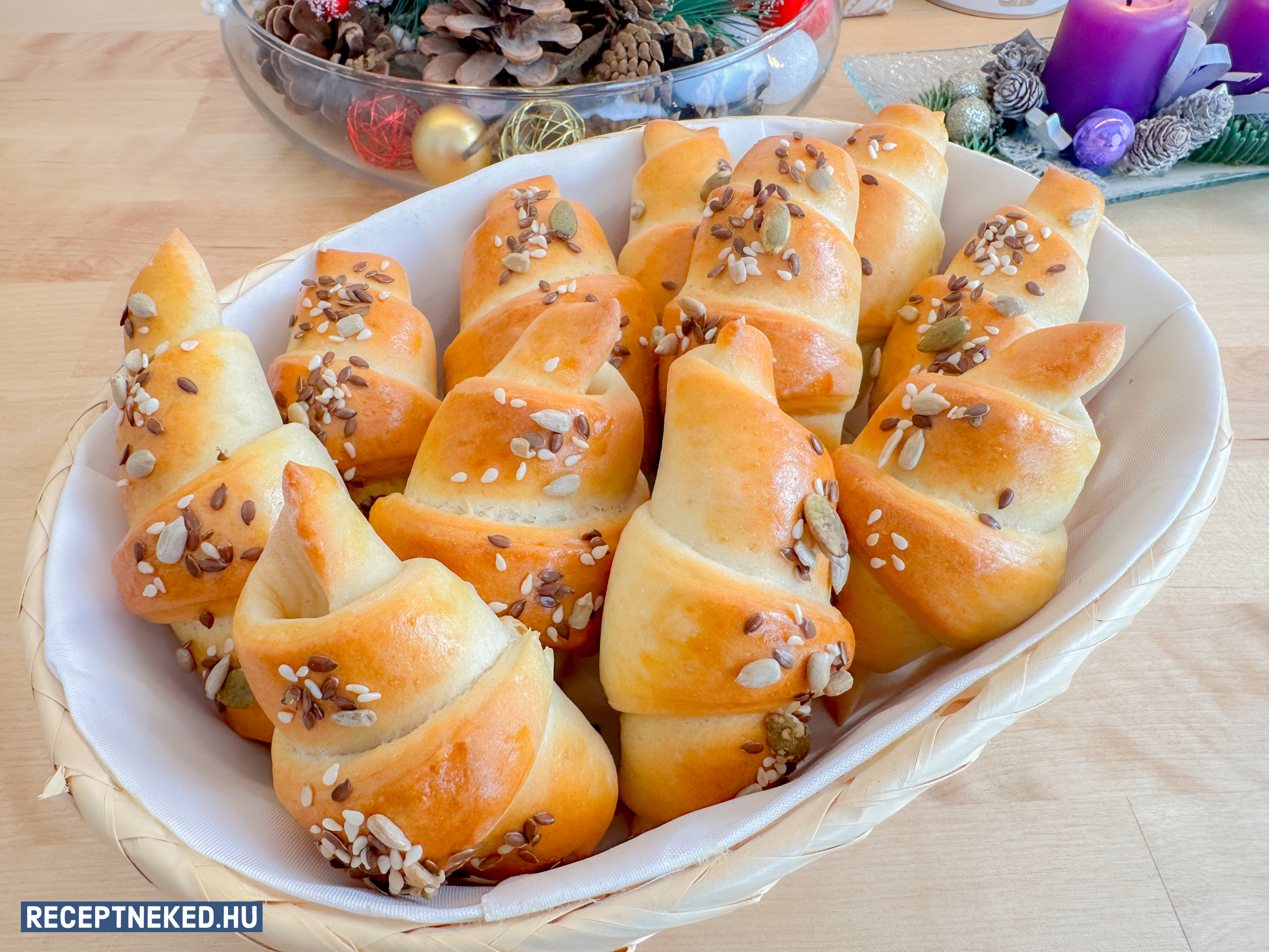 A feltekert kifliket negyed órán keresztül még pihentetjük a tepsiben. Ezután megkenjük a felvert tojással és megszórjuk tetszés szerint magvakkal.