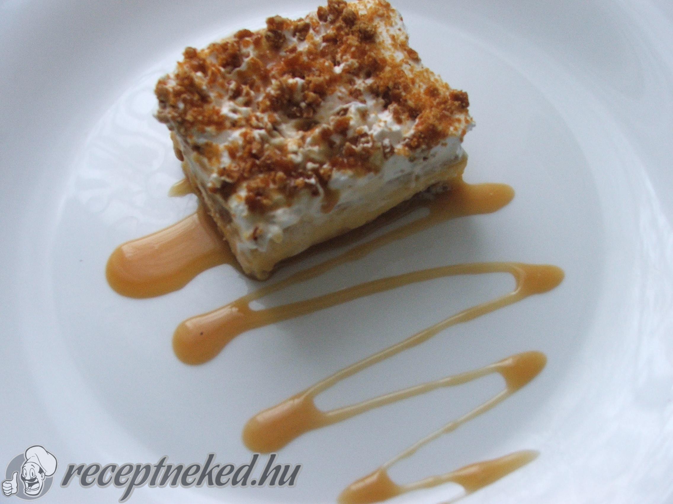 Egy kis szögletes tepsit kibélelünk fóliával, és az alját szorosan kirakjuk keksszel, hogy ne maradjanak hézagok. Erre ráöntjük a kész, már majdnem kihűlt karamellkrémet, majd befedjük egy újabb réteg keksszel. Ezután a vaníliakrémet ráterítjük, és ismét egy réteg kekszet helyezünk a tetejére. A tepsit fóliával lefedjük, és a süteményt egy éjszakára vagy legalább 3 órára a hűtőbe tesszük.