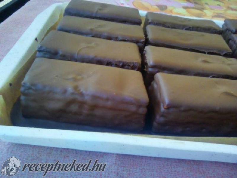 Egy ostyalapot tegyünk tálcára, kenjük meg a krém egynegyedével, majd helyezzünk rá egy újabb lapot. Folytassuk a rétegezést, amíg az összes ostya és krém elfogy. Takarjuk le fóliával és tegyük hűtőbe néhány órára vagy akár egy éjszakára. Ezután recés késsel szeleteljük kb 3 cm széles és 8 cm hosszú darabokra.
