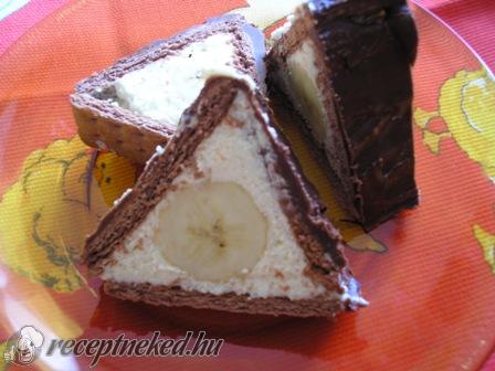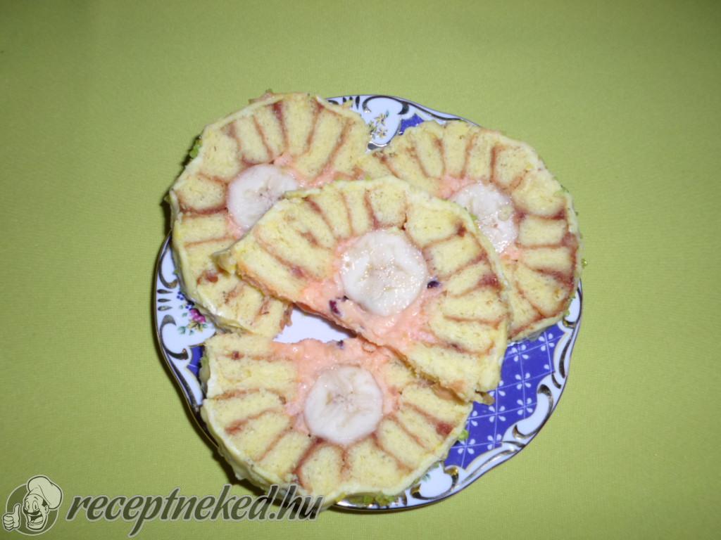 Vegyük ki a hűtőből a formát, majd a kekszes alapra kanalazzunk pár kanál krémet. Ezután helyezzük a közepére a banánt, egy kicsit nyomjuk bele a krémbe, majd egyenletesen kanalazzuk rá a maradék krémet.