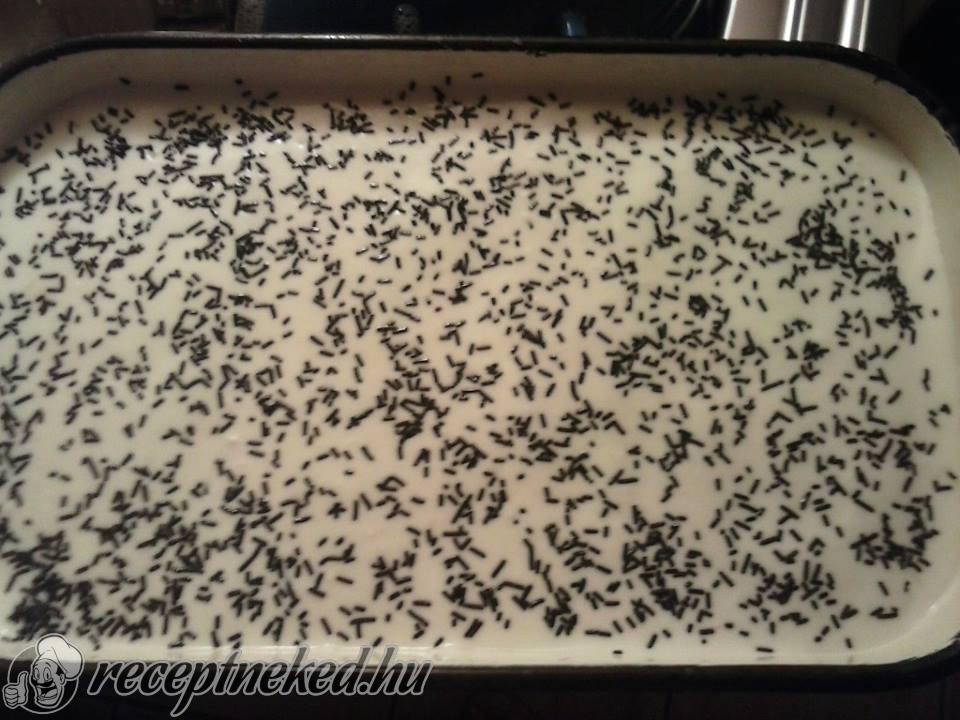 Díszítésnek megszórjuk tortadarával. 1 éjszakára a hűtőben állni hagyjuk, hogy a piskóta megpuhuljon.