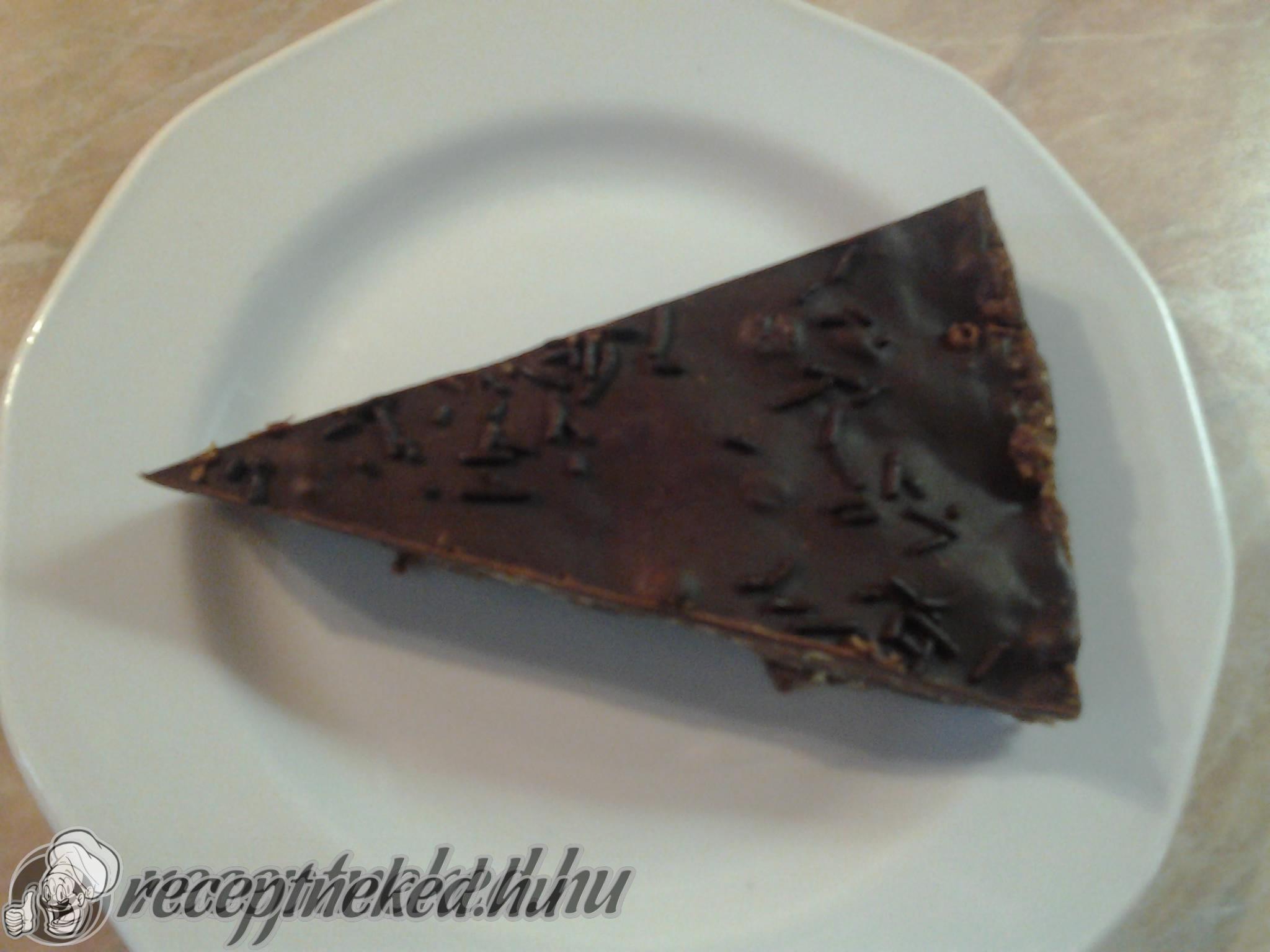 Hozzáöntjük a kakaós kekszhez és jól összegyúrjuk. Egy tortaformába tesszük és kézzel szépen elegyengetjük. Elkészítjük a mázat: a vajat és a csokit gőz fölött felolvasztjuk és ráöntjük. Megszórjuk tortadarával és néhány órára hűtőbe tesszük.