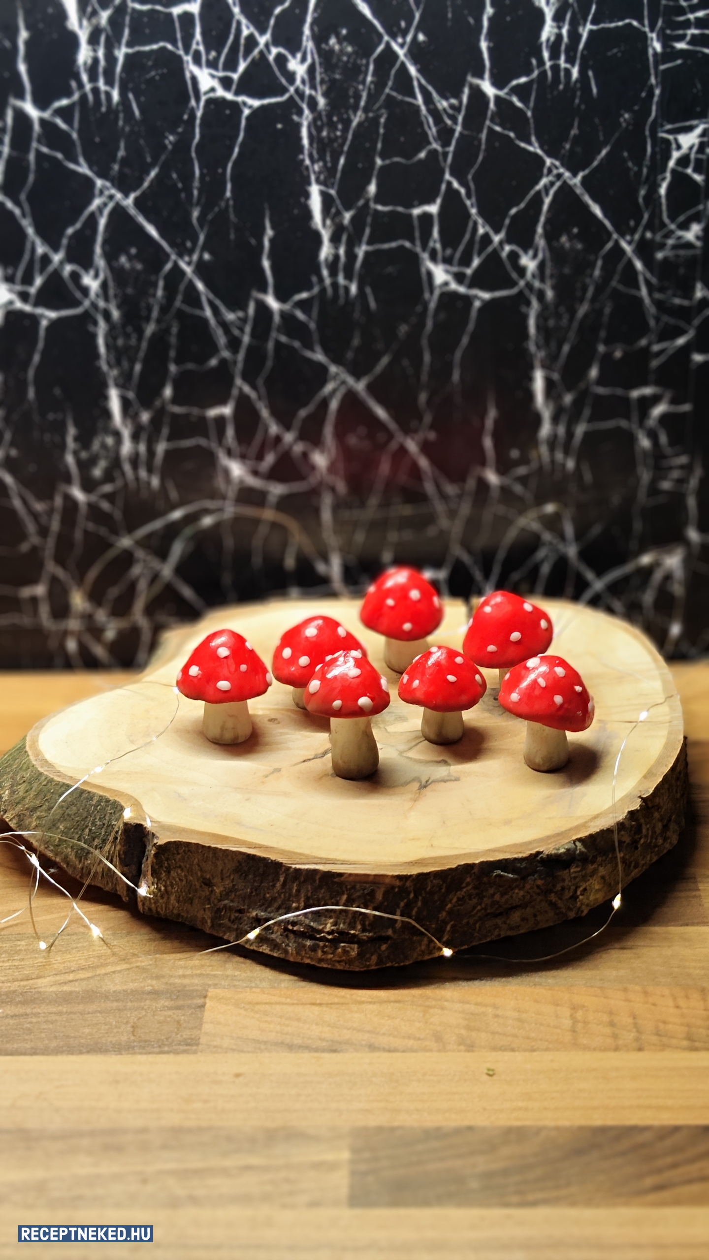 A másik feléből egy picit lecsípünk a gombák pettyeihez, a többit pedig egy 30 cm-es hengerré formázzuk. 8 db egyforma nagyságú szakaszt vágunk le belőle, ezek lesznek a tönkök.