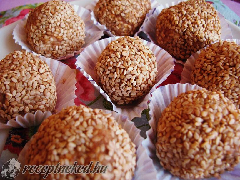 Nedves kézzel formázzunk golyókat, és forgassuk meg a pirított szezámmagban.