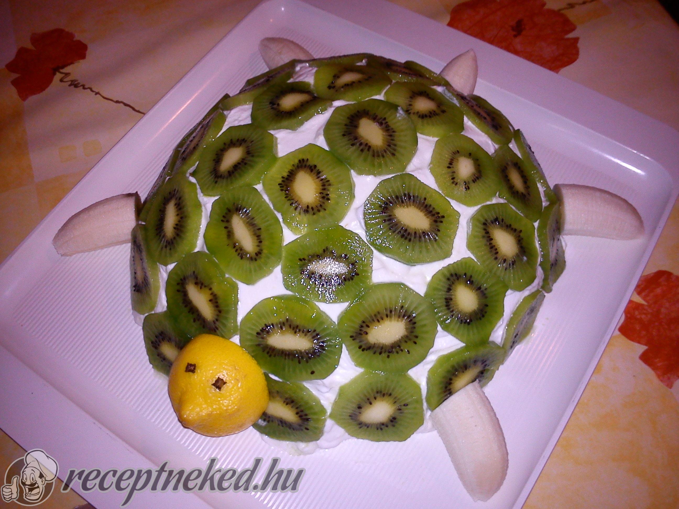 Egy tálcán ovális alakban elterítünk egy réteg krémet, erre egy sor piskótatallért rakunk. Ezt ismét krém követi, kisebb átmérőben, majd újabb sor piskóta. Addig rétegezzük, amíg elfogy az alapanyag, végül a tetejét krémmel zárjuk. A teljes felületét kivi szeletekkel befedjük, így megkapja a teknős páncélját.