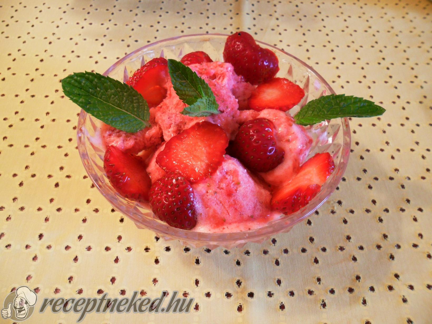 Az epret megmossuk, kézzel összenyomkodjuk, majd hozzáadjuk a cukrot, és géppel körülbelül 10 percig keverjük. Ezután egyenként hozzáadjuk a tojásfehérjéket, és keményedésig keverjük, amíg sűrű habot kapunk.