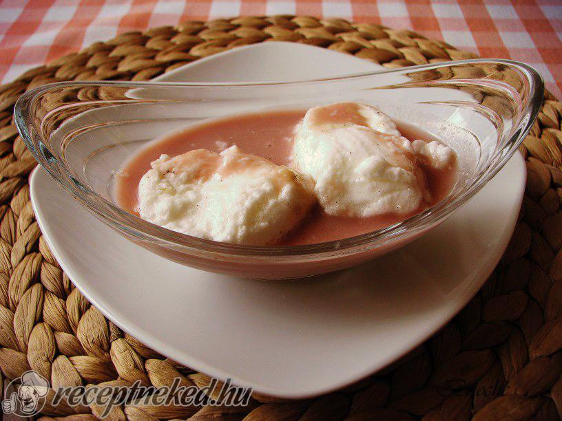 Ezután, a maradék vaníliás tejhez öntsük hozzá a tejes-epres keveréket. A tojássárgáját, a mézet, a maradék cukrot és az egy evőkanálnyi lisztet kézi habverővel keverjük ki, egy kis langyos epres tejjel öntsük fel, és dolgozzuk teljesen csomómentesre, majd öntsük a maradék tejhez, és főzzük közepesen sűrűre. Ha elkészült, reszeljük hozzá az egy citrom héját, keverjük össze, rakjuk tálalótálba, és helyezzük rá a habgaluskákat. Jól hűtsük be, és hidegen tálaljuk!