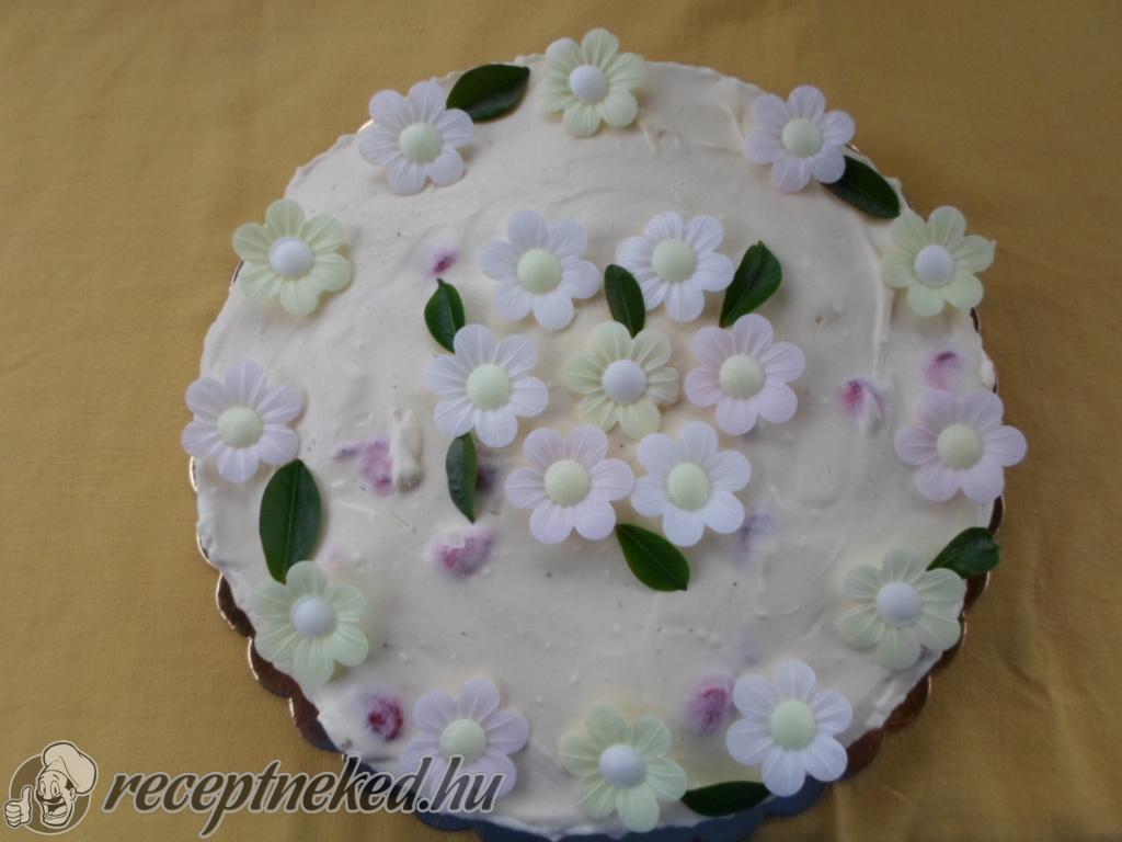 Ezután a torta tetejét ízlés szerint rakjuk ki eperrel, majd tegyük be pár órára a hűtőbe, hogy a krém teljesen megdermedjen, és az ízek kellően összeérjenek (én előző nap összeállítottam a tortát, majd tálalásig a hűtőben pihent).