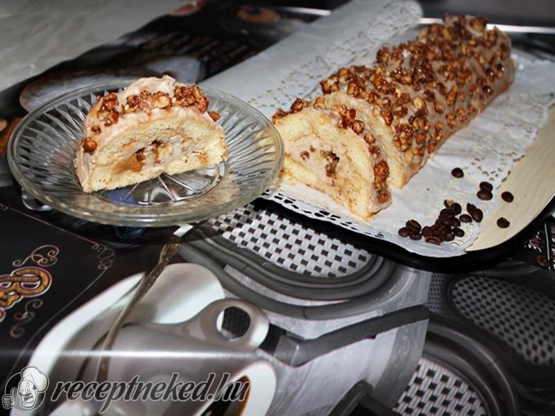 Belesimítjuk a kávés-grillázsos krémet (3-4 evőkanállal tegyünk félre), majd zárjuk le 4*3, tejbe mártogatott piskótával (azaz 4 piskóta kerüljön egymás mellé). Hajtsuk rá az oldalról lelógó folpackot és tegyünk az egészre egy hosszabb deszkát és arra valami kis súlyt.
