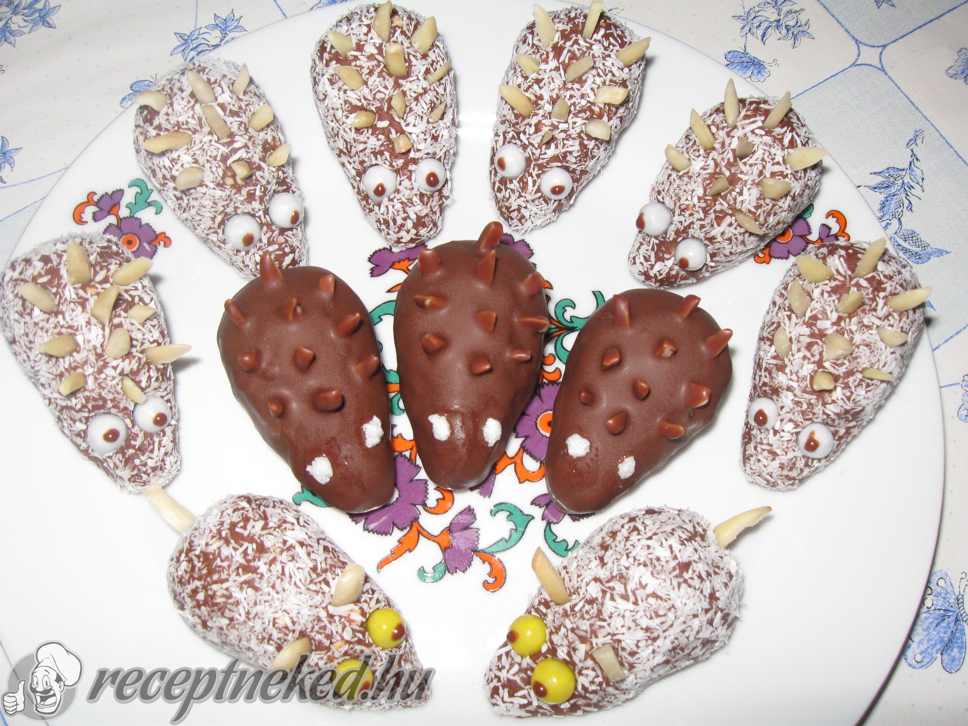 A csokit 2 evőkanál olajjal felolvasztjuk, a süniket rácsra tesszük és bevonjuk a csokival. Hűtőben dermesztjük, fehér csokiból szemeket rajzolunk rá. A kókuszoshoz először a kókuszreszelékbe forgatjuk a süniket és utána megtűzdeljük a mandulával. Szemének francia drazsét használunk.
