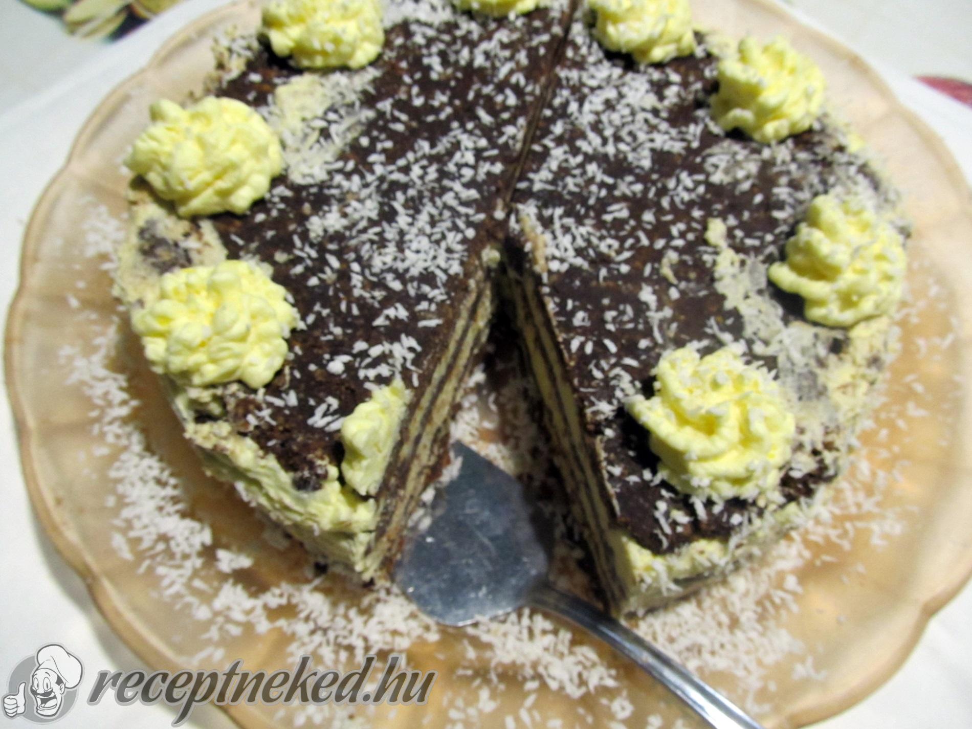 A maradék kekszes tésztából 3 db 0,5 cm-es kerek lapot nyújtunk és ezt rétegezzük a formába a meggyes-csokis krémmel. A tortánk tetejét krémmel zárjuk és a kimaradt tésztából készíthetünk dekorációnak kókuszgolyót is.