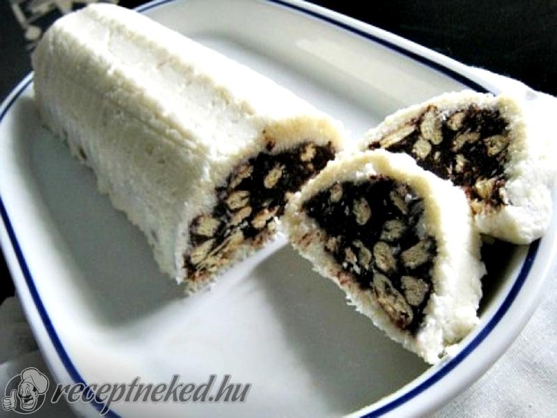 Egy őzgerincformát folpackkal kibélelünk és belenyomkodjuk a kókuszos masszát úgy, hogy az oldalára is kerüljön és a tetejére is jusson.