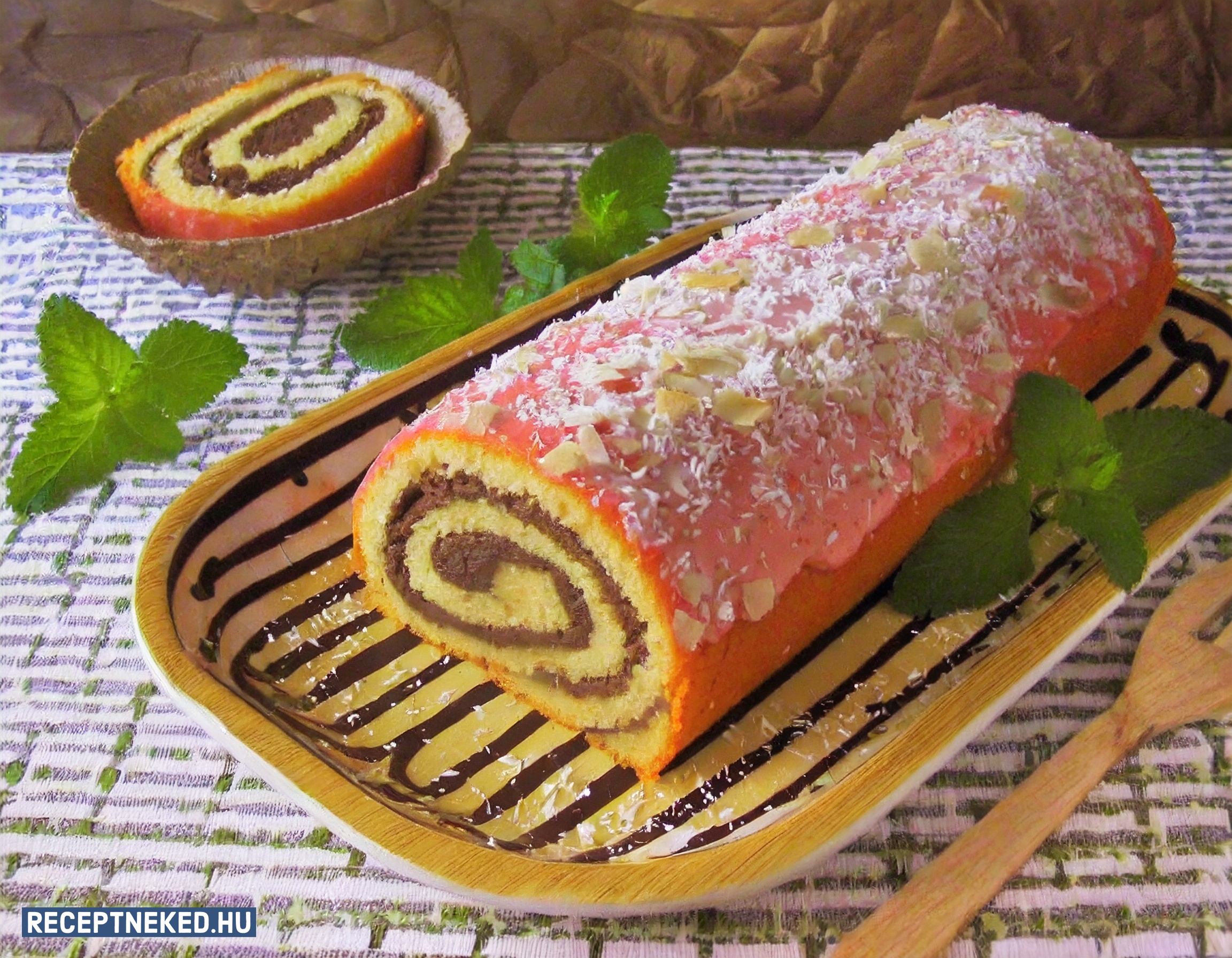 Másnap a díszítéshez a csokit és a tejszínt összeolvasztjuk, majd csíkokat húzunk vele a rolád tetejére. Amint megszáradt, szeletekre vágjuk és tálaljuk.