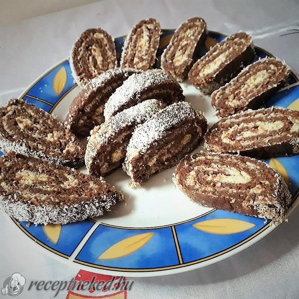 Két fólia vagy sütőpapír küzött téglalap alakúra kinyújtjuk a kakaós masszát vékonyra, majd elterítjük rajta egyenletesen a tölteléket és feltekerjük. A kész rudat körbekenjük az aromával, megszórjuk kókuszreszelékkel és folpackba csomagolva 1-2 órára hűtőbe tesszük.