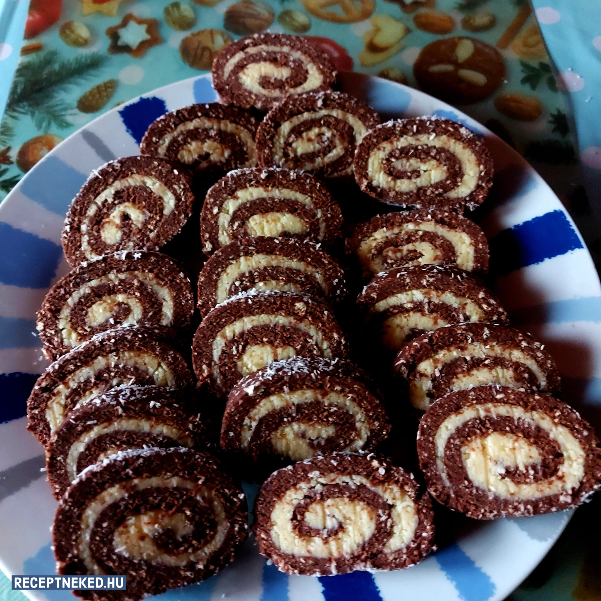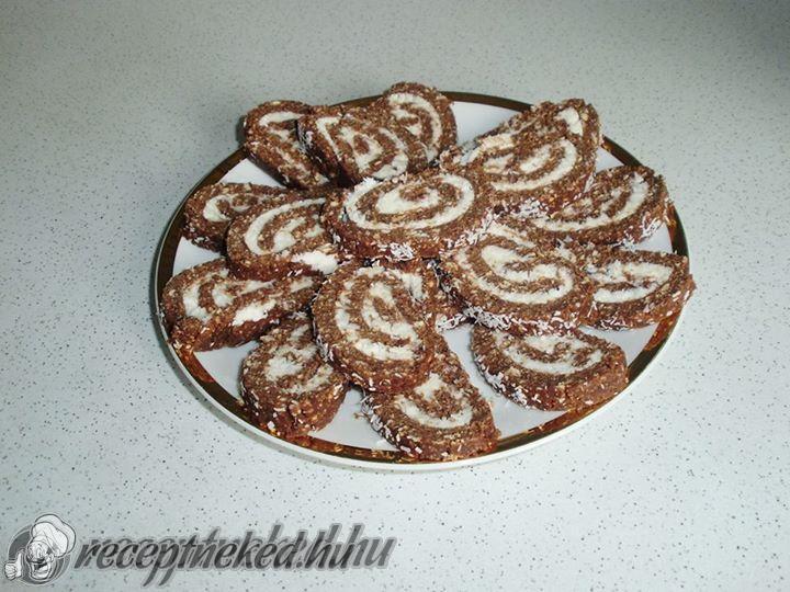 Szorosan feltekerjük és beleforgatjuk a kókuszreszelékbe. Hűtőbe tesszük pár órára, majd szeleteljük.