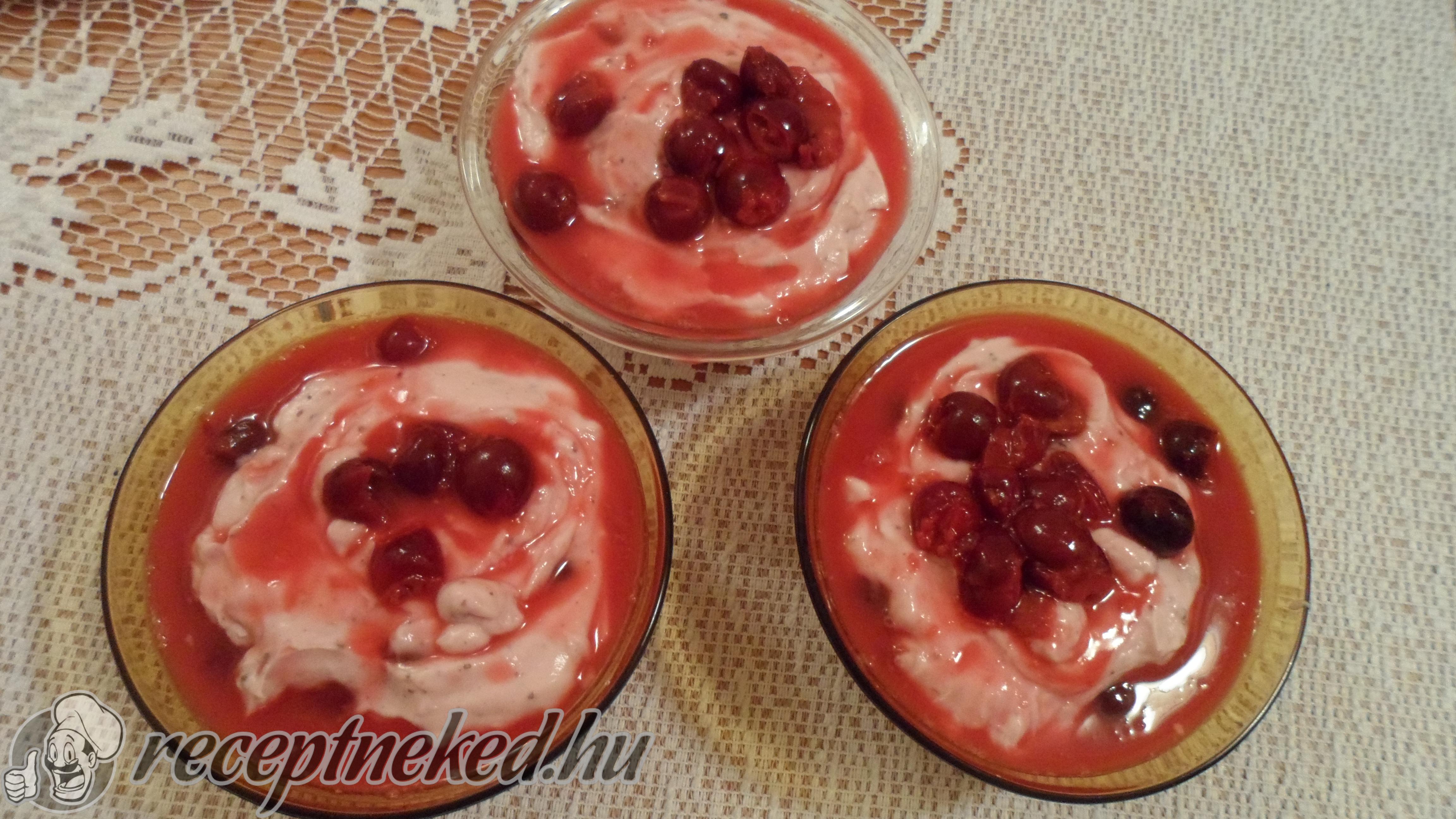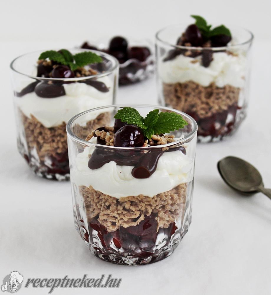 Megfőzzük a pudingot a cukorral és a tejjel, majd kihűtjük. A kihűlt pudingot összekeverjük a felvert tejszínnel. A meggyre rumot és cukrot teszünk. A piskótát vagy kekszet kisebb darabokra vágjuk. A pohár aljára tesszük a piskótát vagy kekszet, erre tesszük a tejszínhabos krémet, majd erre a rumba áztatott meggyet. Tetejére pedig tejszínhabot teszünk és díszíthetjük […]