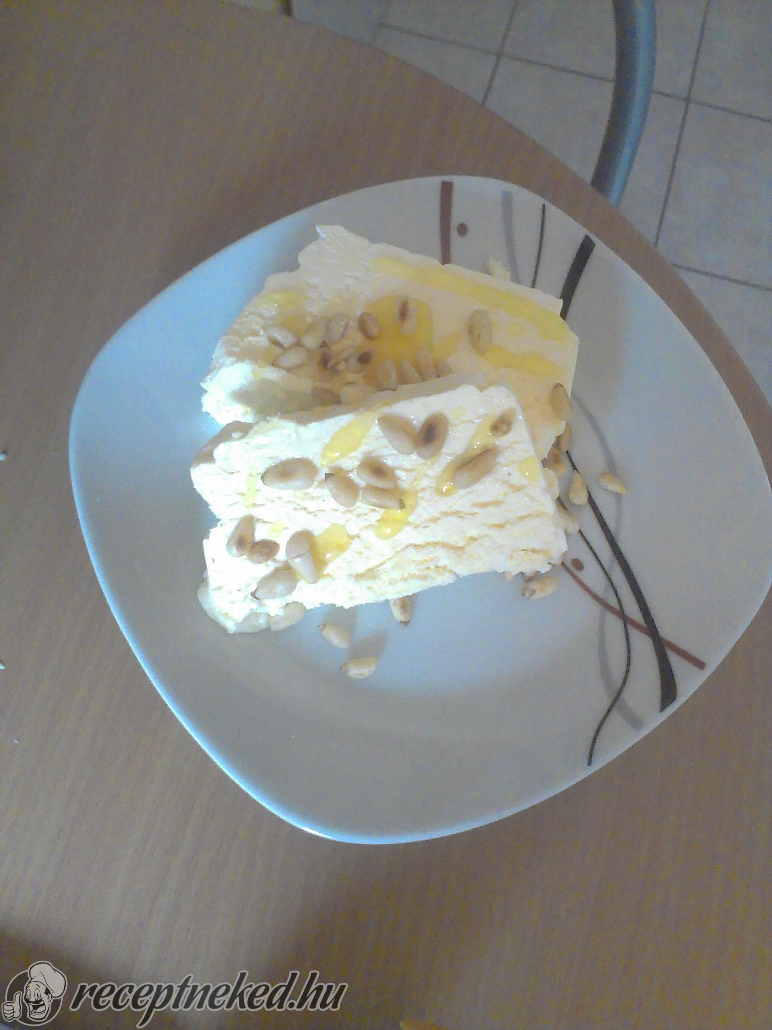 Ha megfagyott, hidegen tálaljuk, pirított fenyőmaggal és mandulaszeletekkel.
