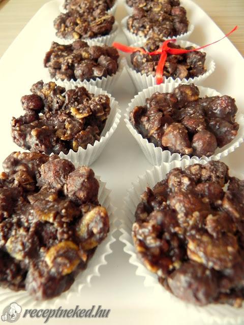 A csokoládét darabokra tördeljük, a vajat kockákra vágjuk, majd egy tálban mikróban – fokozatos melegítéssel, vigyázva, hogy ne égjen meg – felolvasztjuk. Simára keverjük, majd hozzáadjuk a gabonagolyókat és a kukoricapelyhet. Végül beleforgatjuk a durvára darált mogyorót (vagy más csonthéjast, például diót, mandulát).