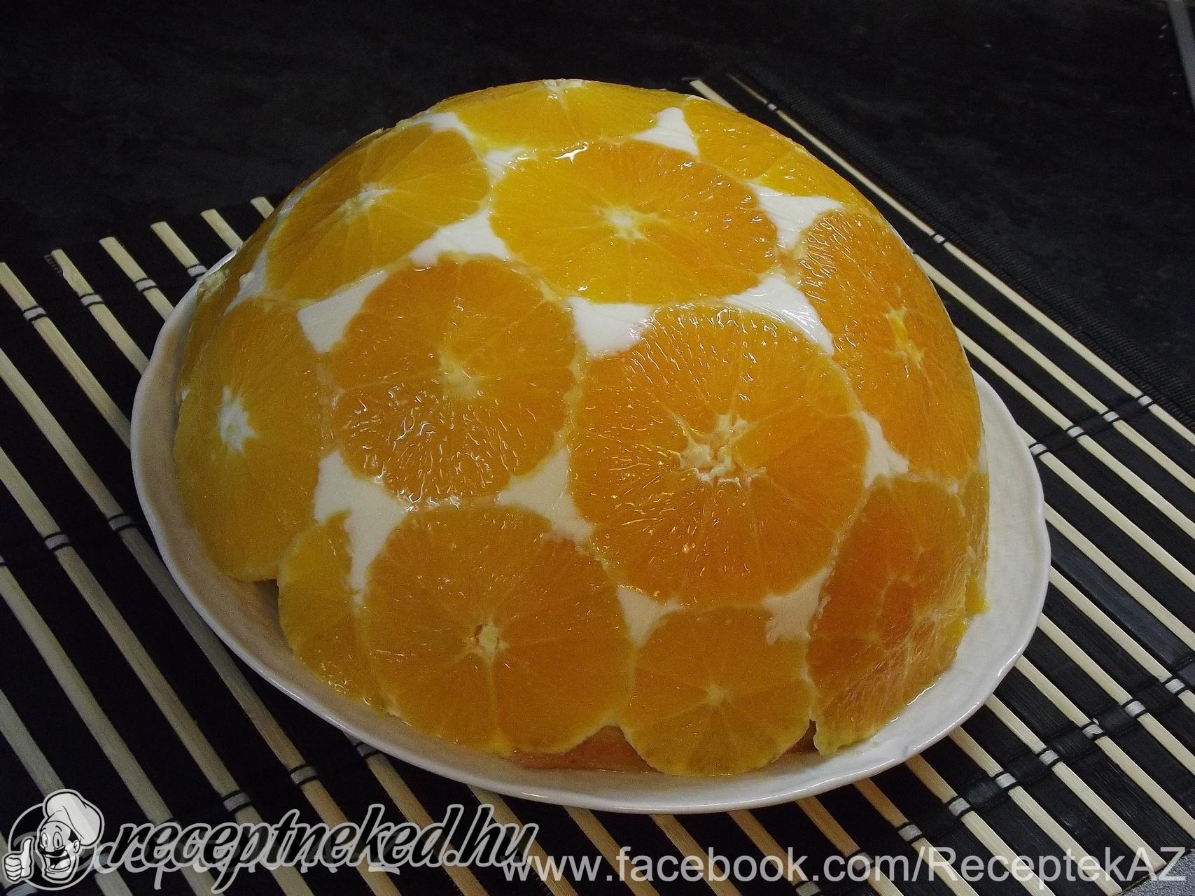 A narancsokat meghámozzuk, kb. 1 cm vastag karikákra vágjuk. Folpack-kal kibélelünk egy tálat (nekünk 2,5 l tál), majd az alját és az oldalát kirakjuk a narancskarikákkal és elkészítjük a túrós-joghurtos tölteléket.