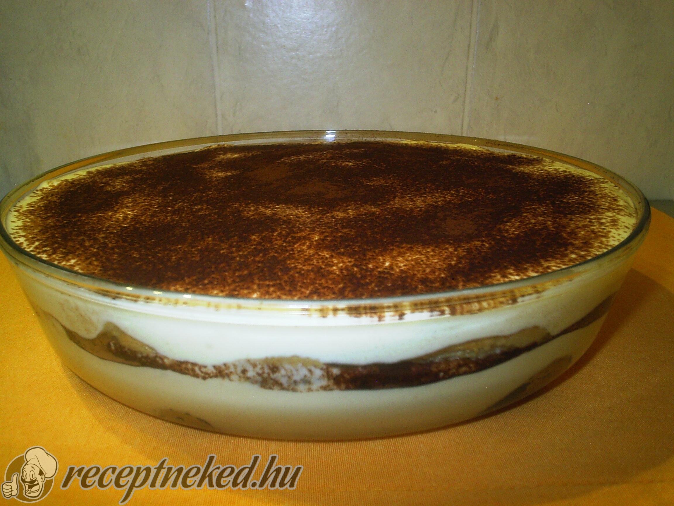 Egy tepsi, jénai vagy sütikeret aljára leteszünk 21 darab babapiskótát, amit előtte tejbe mártottunk. A maradék krém felét egyenletesen rásimítjuk a babapiskótákra, majd újabb adag babapiskóta következik. A babapiskóták után jön a krém és a végén a maradék babapiskóta. Az utolsó adag babapiskótára rákenjük a kevés félretett krémet. Nem baj, hogy kevés és be fogja szívni, úgyis plusz tejszínhabbal díszítjük másnap. Ha nem ez a célunk, akkor osszuk nyugodtan el egyenlően 3 részre a krémet.
