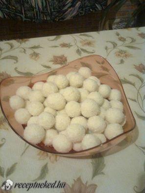 Másnap felszeljük a süteményt, a tetejét tejszínhab halmokkal, felezett raffaello golyókkal és kókuszchipssel díszítjük.