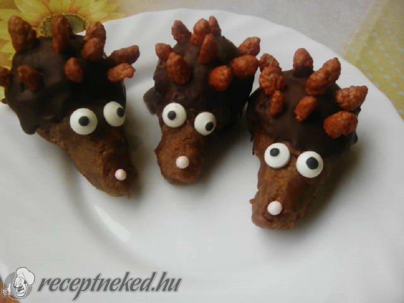 A masszából golyókat, azokból pedig süniket formálunk. A sünik hátát olvasztott csokoládéba mártjuk, cukorgyöngyből szemet és orrot ragasztunk rájuk és ziziből tüskéket szúrunk a hátukba.