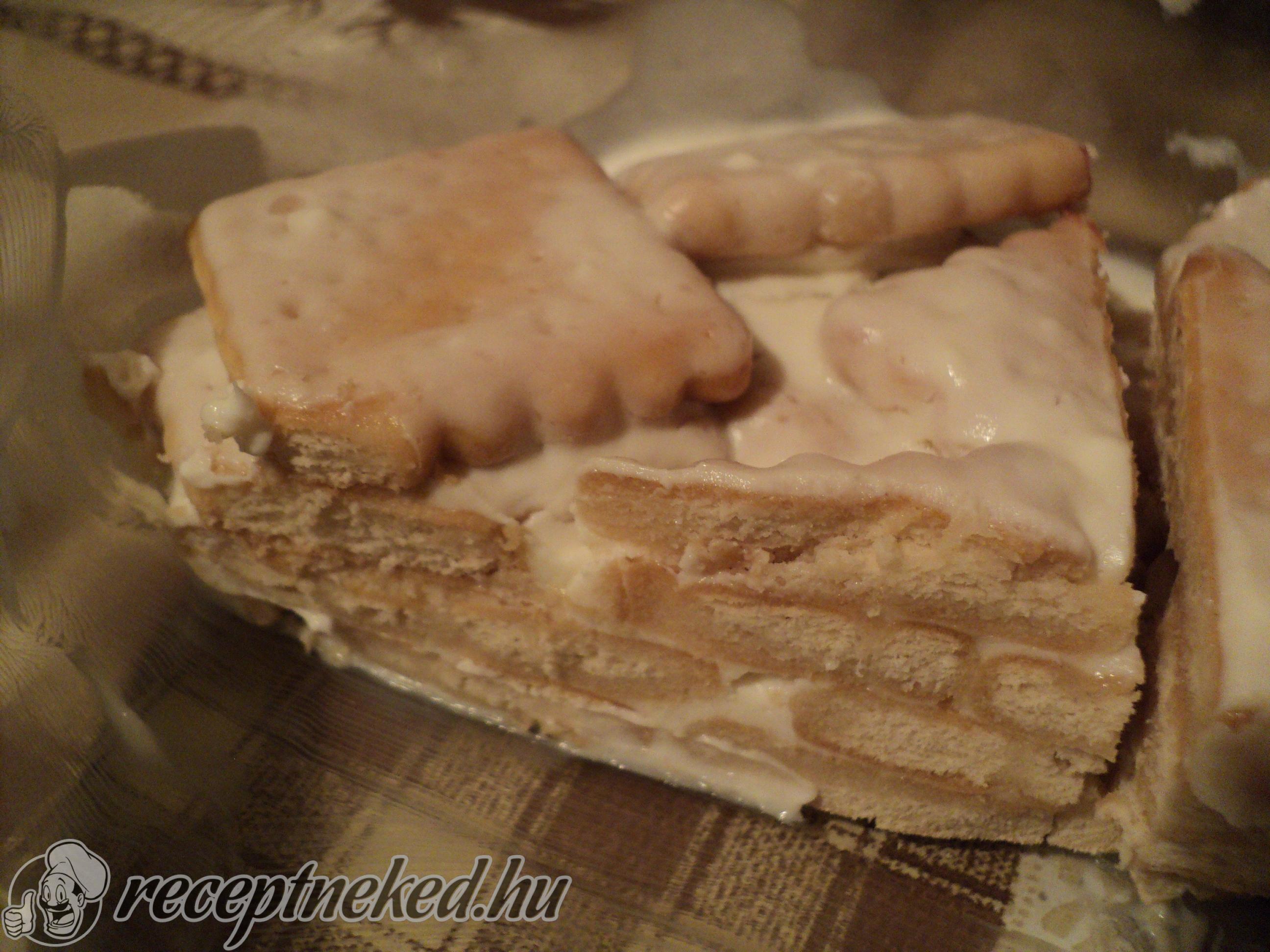 Egy másik edénybe vagy tepsibe teszünk egy réteg kekszet, aztán megkenjük a tejfölös keverékkel. Ezt addig folytatjuk rétegezve, míg el nem fogy a hozzávalónk. A felső réteg tejföl legyen. A tetejét citromkarikákkal is lehet díszíteni. Betesszük egy napra hűtőbe, hogy a keksz megpuhuljon, majd szeletelhető és fogyasztható. Nagyon egyszerű, és finom! Jó étvágyat!
