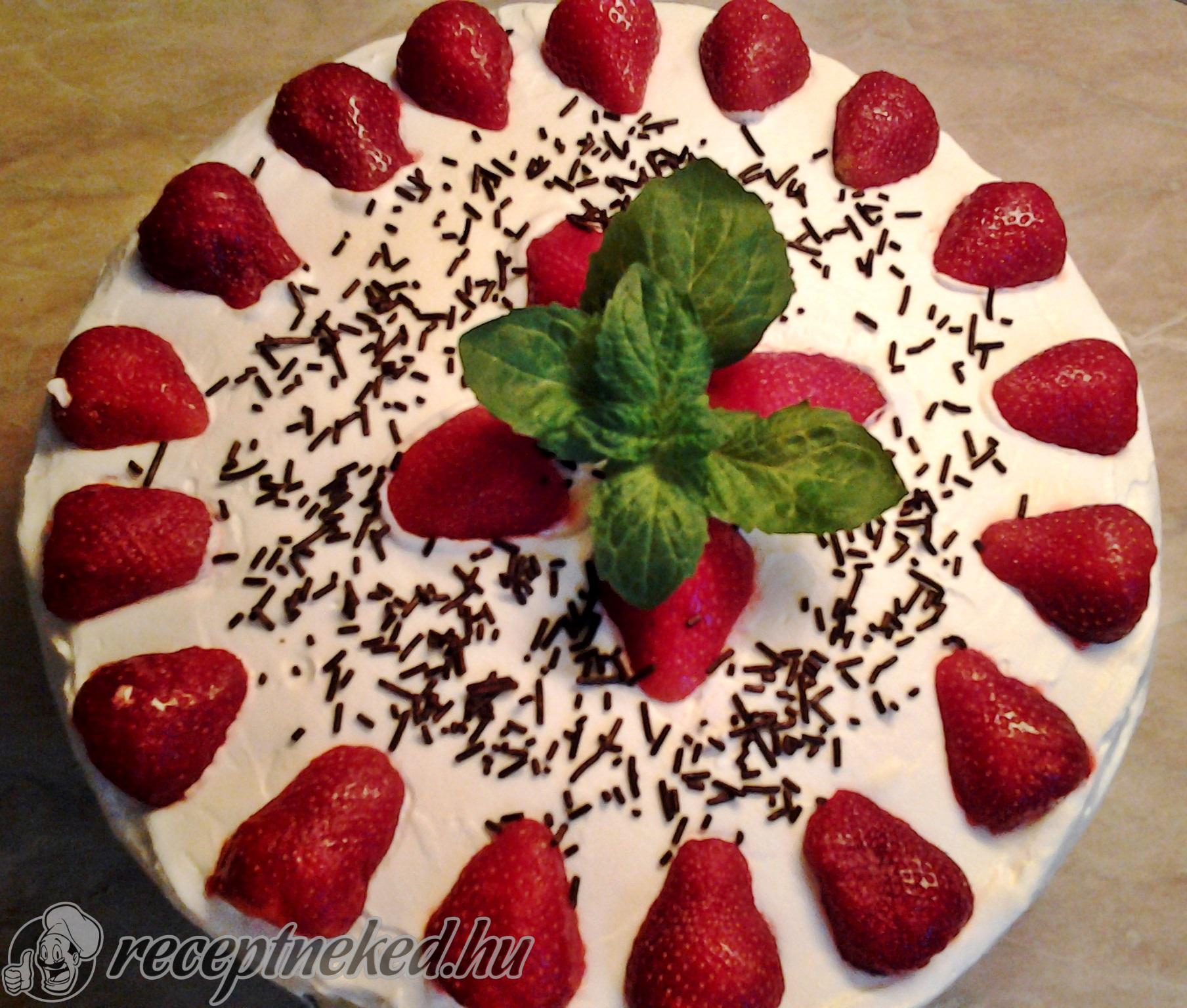 A tejszínhab tetejét reszelt étcsokoládéval vagy tortadarával megszórjuk, és friss eperszemekkel díszítjük. A kész tortát legalább egy éjszakára a hűtőbe tesszük, hogy teljesen megdermedjen és összeérjenek az ízek.