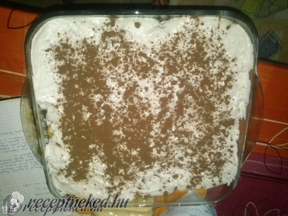 A kávéba beleöntjük a rumaromát és ebbe mártogatjuk bele a babpiskótákat. Egy nagy tálba elkezdjük sorba tenni a beáztatott piskótákat, majd leöntjük a krém felével, újabb piskóta réteget teszünk le, azt is leöntjük a krémmel. A tetejét meghintjük kakaóporral és betesszük állni a hűtőbe.