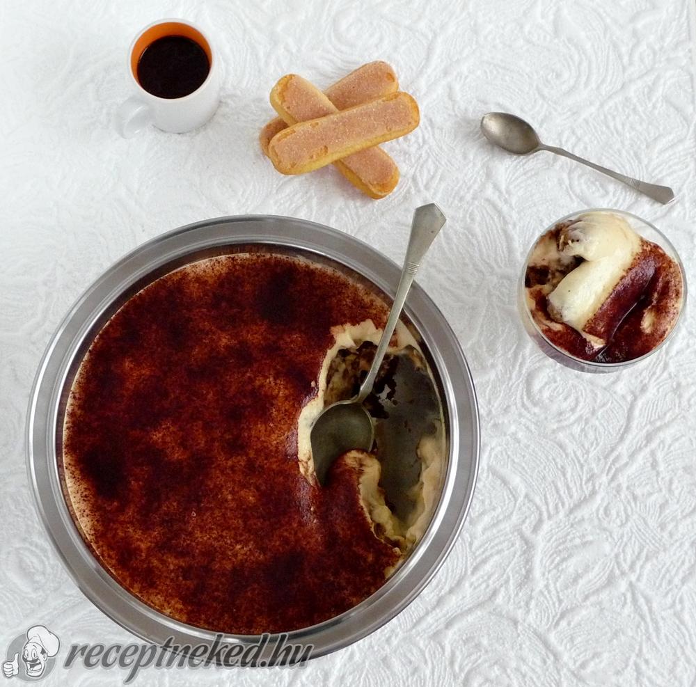 Ezután kanalazzuk rá a mascarponés krém felét, és szórjuk meg cukrozott kakaóval, majd a maradék kávéba mártogatott babapiskótával fedjük be a krémes réteget. Ezután szintén locsoljuk meg a piskótát ízlés szerint likőrrel, majd kanalazzuk rá a maradék krémet, és szórjuk meg bőségesen a cukrozott kakaóporral.