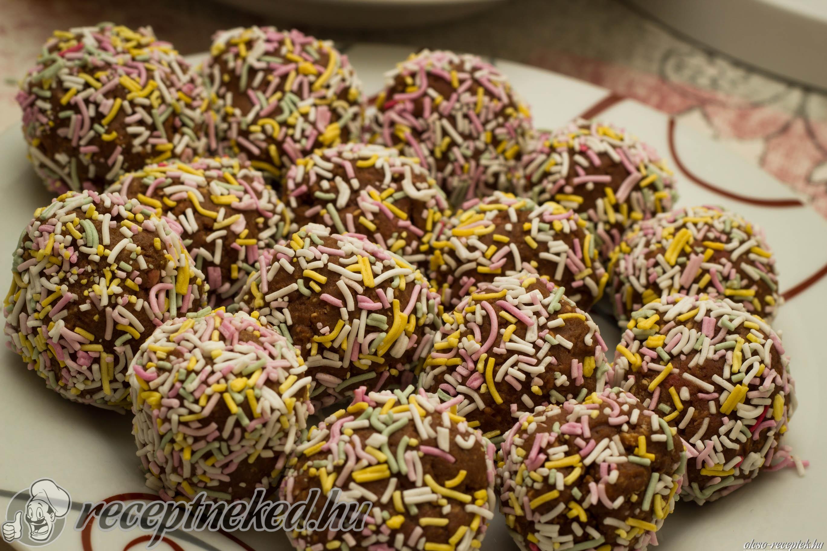 A hűtőből kivéve diónagyságú golyókat formálunk a masszából, majd a kakaóporba forgatjuk.