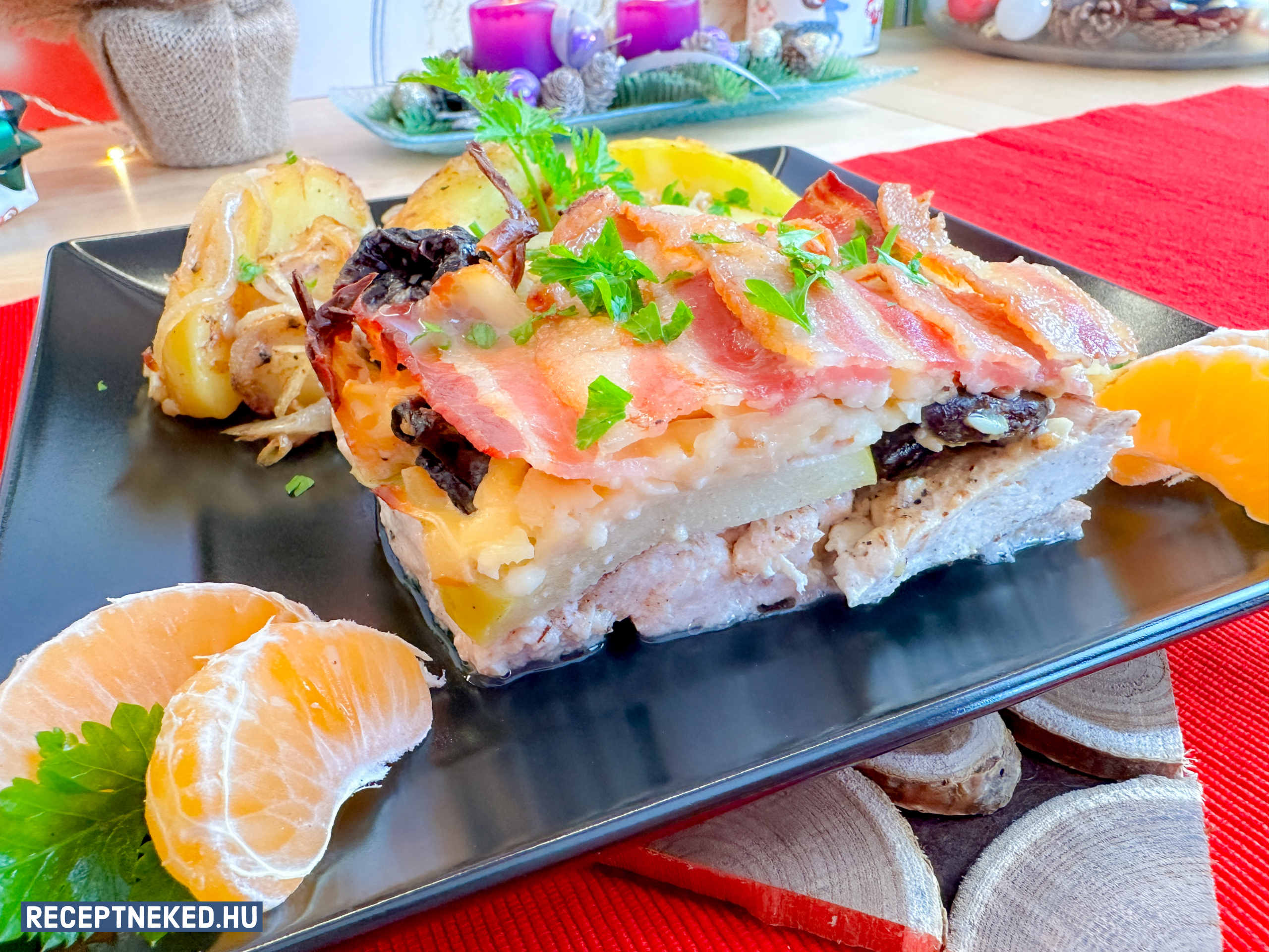 Előveszünk egy közepes tepsit, jénait vagy porcelán edényt és belefektetjük a hússzeleteket. A húsra fektetjük a felszeletelt almát, az almán eloszlatjuk a lecsepegtetett szilvát. Ekkor ráöntjük a fűszeres tejszínt és rászórjuk a sajtot, majd a tetejét befedjük bacon szeletekkel.