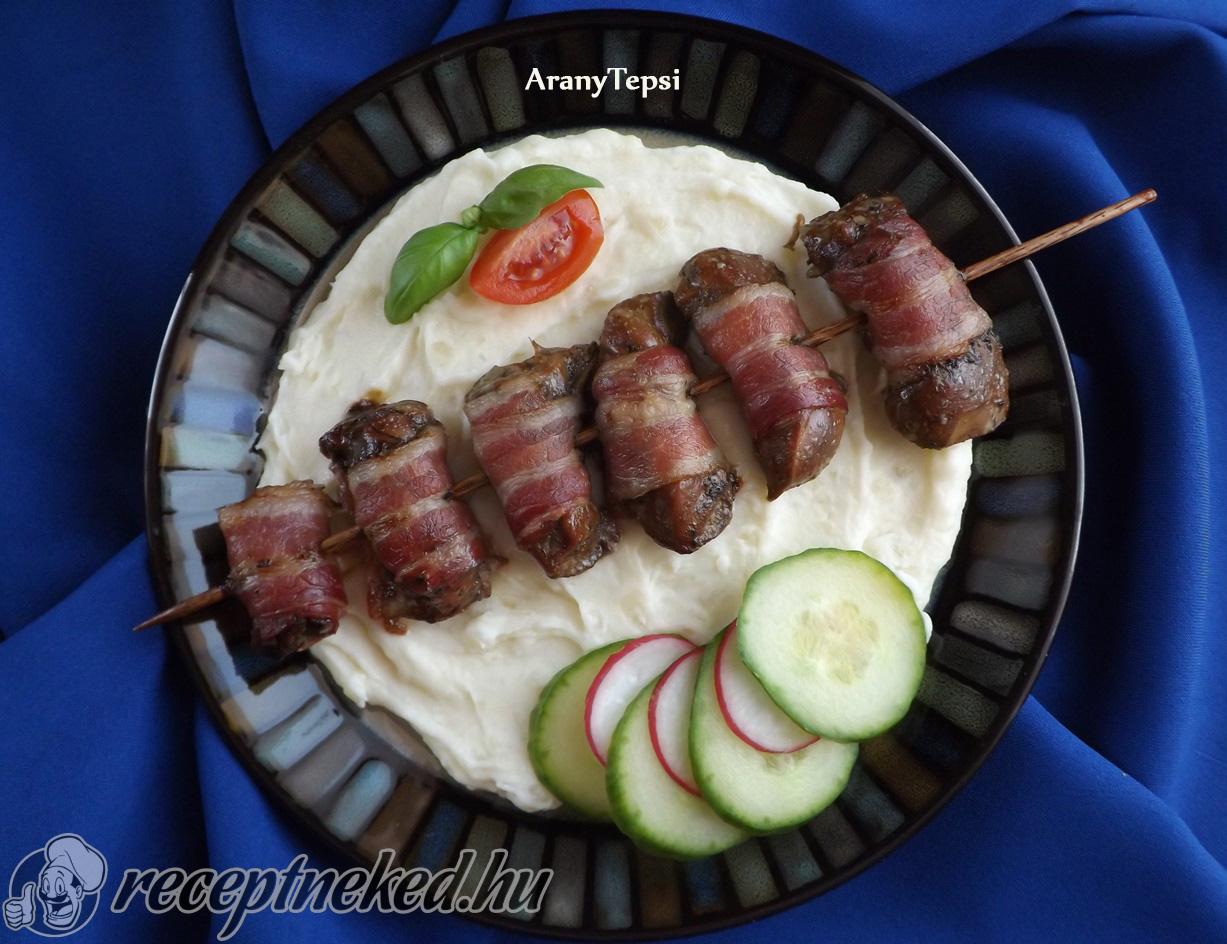 Egy nagyobb tepsit kikenünk kevés zsírral. A vékony szalonnaszeleteket keresztben elfelezzük, és minden darab csirkemájat betekerünk szorosan egy bacon darabba.