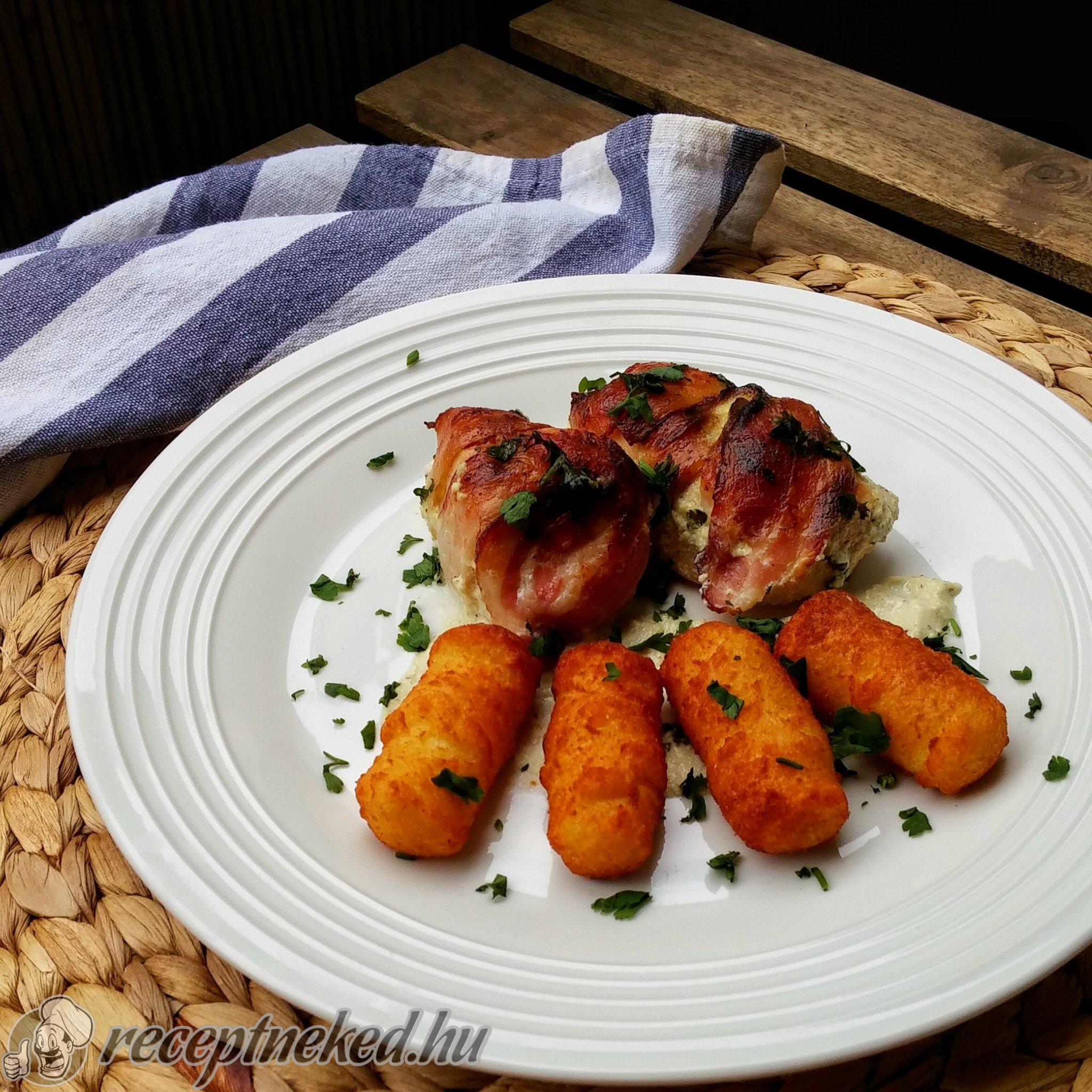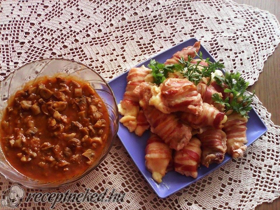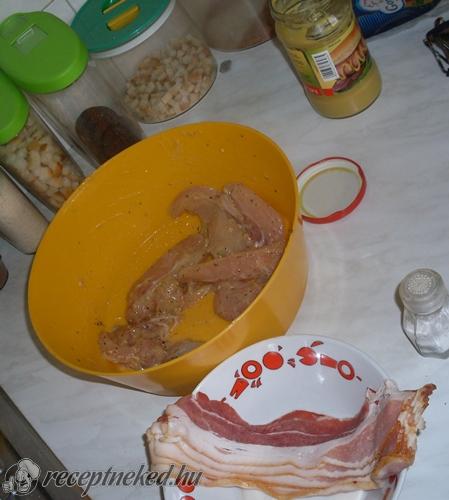 A csirkemellre teszünk 2 csipet sajtot, majd 2 szem aszalt szilvát is. Feltekerjük és 1-2 szelet baconbe beletekerjük (a hús nagyságától függően).
