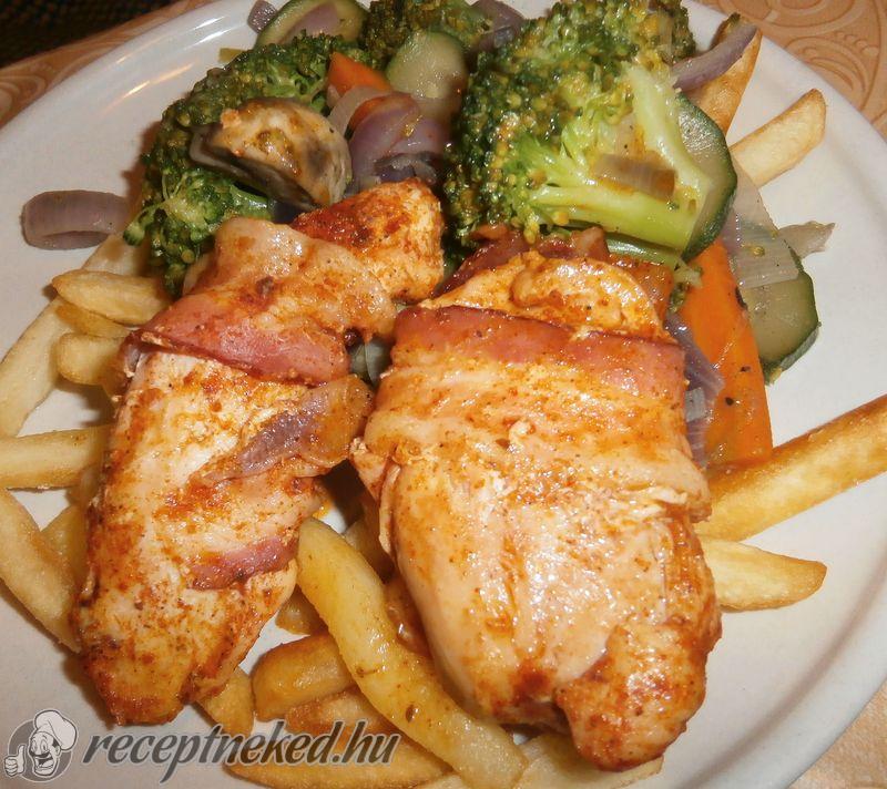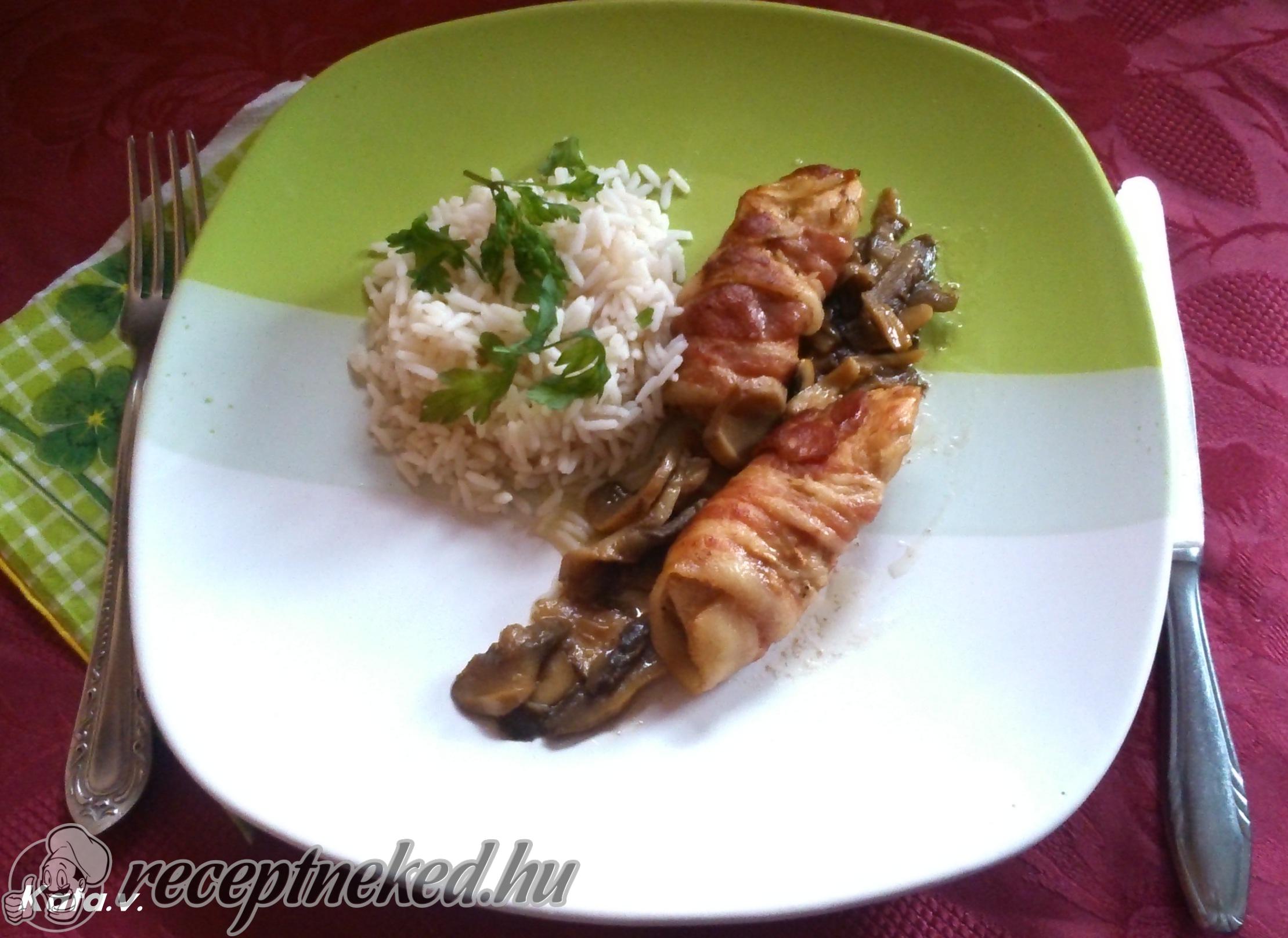 A zöldséges rizst a baconbe tekert, sajttal és aszalt szilvával töltött csirkemell mellé tálaljuk. Ízlés szerint a rizst megszórjuk szárított petrezselyemmel tálalás és fogyasztás előtt.