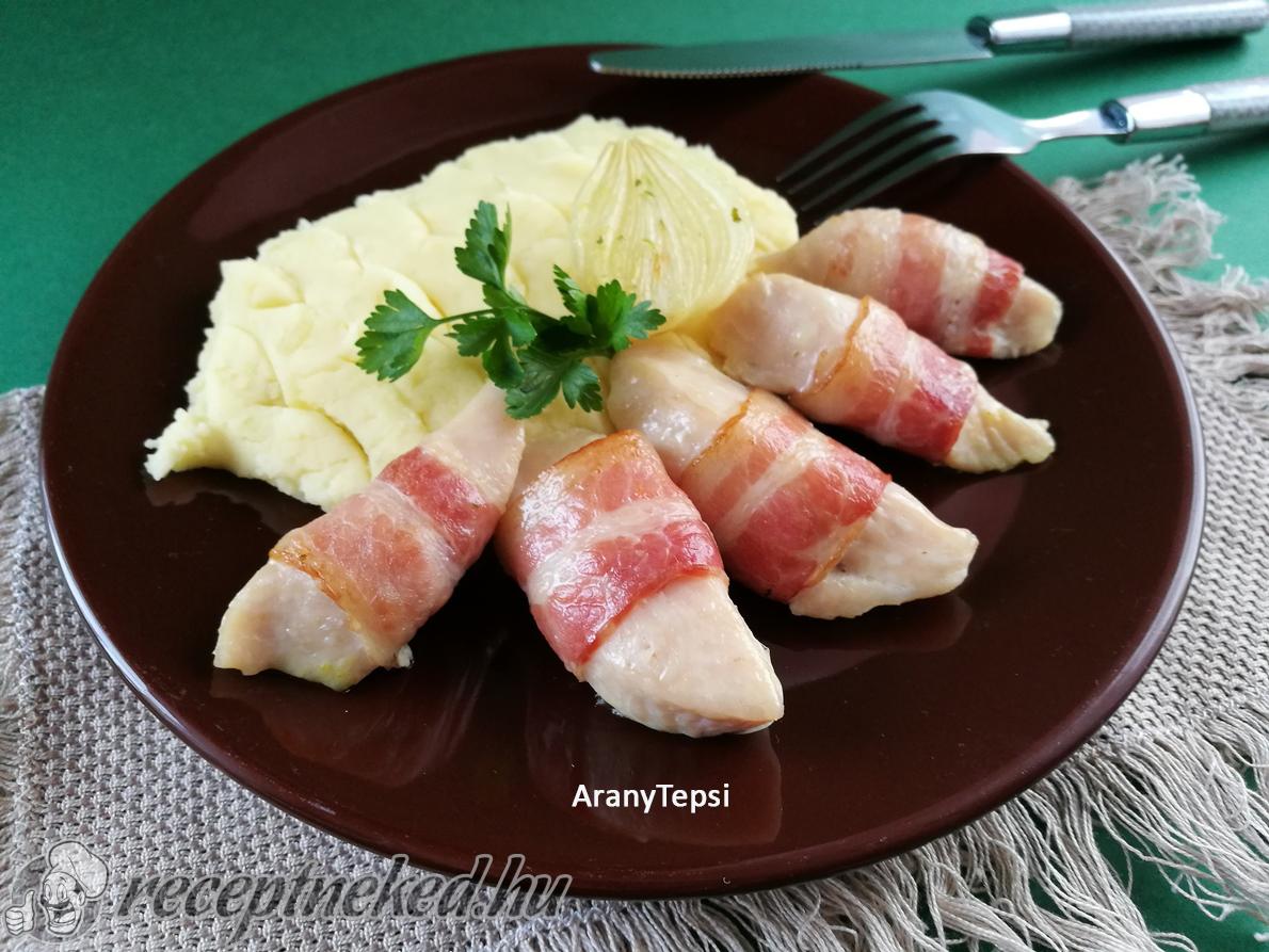 A megtisztított csirkét ujjnyi vastag csíkokra vágjuk és meghintjük sóval. A szalonna szeleteket keresztben félbe vágjuk. Minden darab csirkét betekerünk egy fél szalonnába.