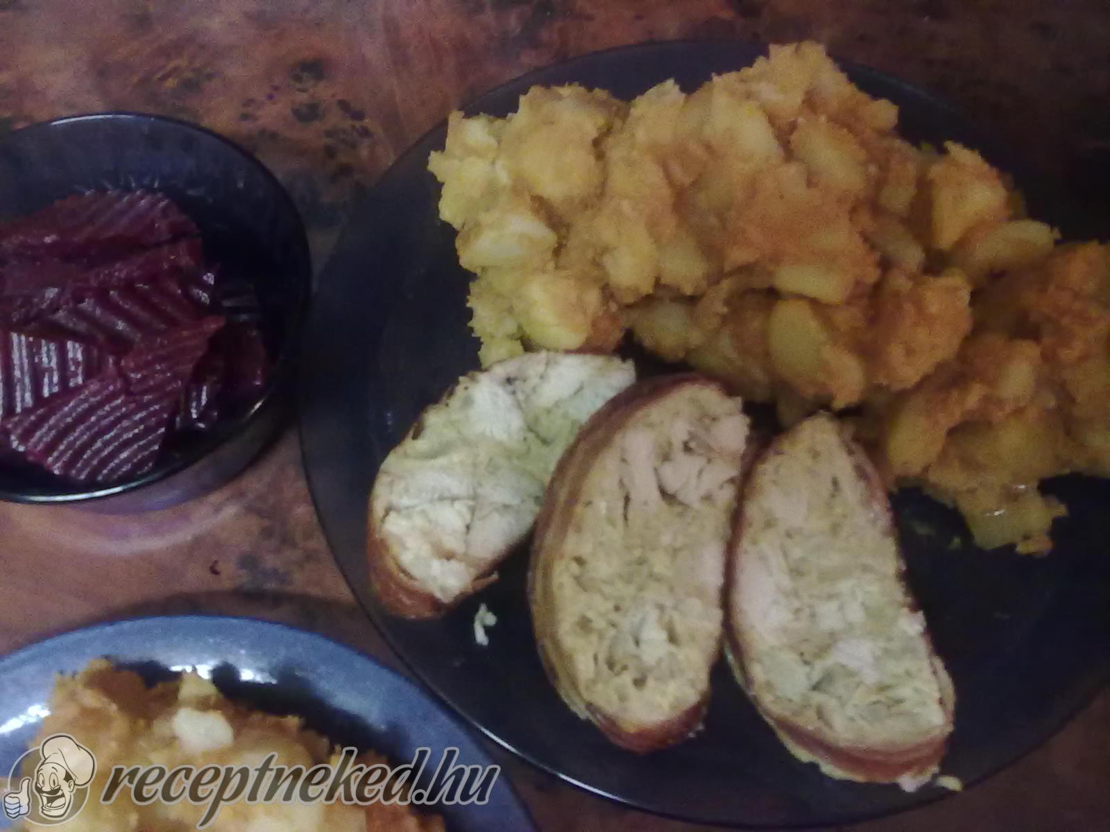 Szeletelve, hagymás krumplival és céklával tálaljuk.