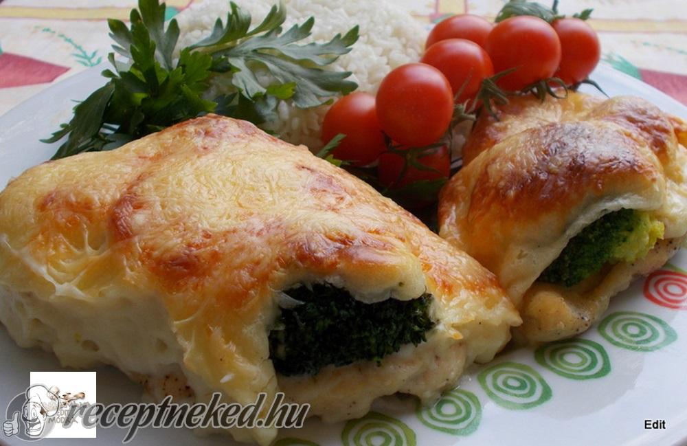 A tepsiben várakozó húsokon elosztjuk a brokkolit, mindegyik tetejére adagolunk a mártásból és reszelt sajttal megszórjuk.