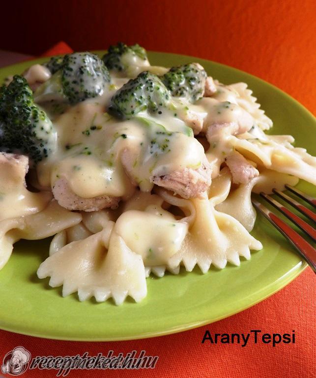 A tésztát tányérra szedjük, halmozunk rá a csirkéből, végül kanalazunk rá a brokkolis szószból.