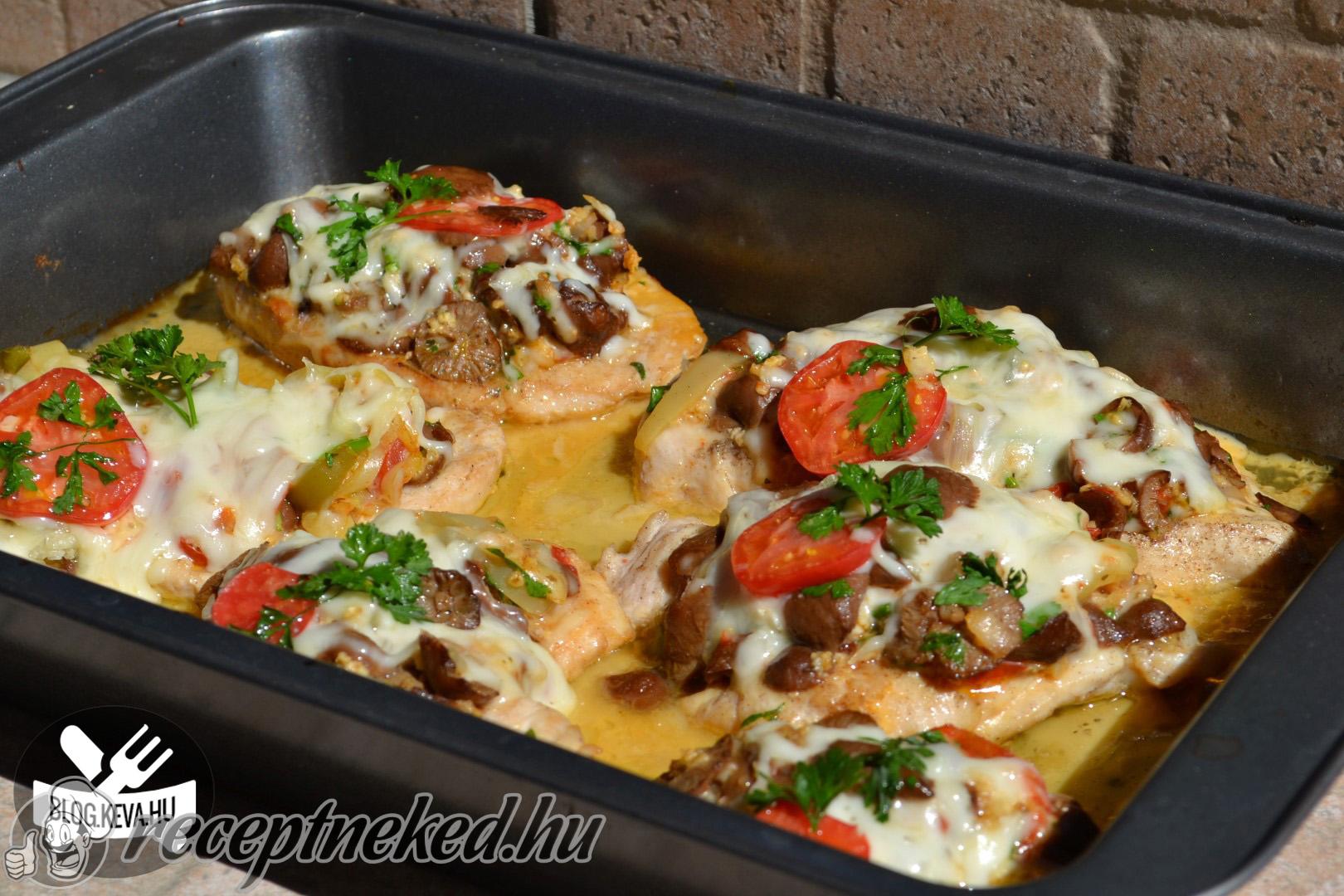A tojásos keveréket elosztjuk a hússzeleteken, majd 200 fokos sütőben kb 30 percig sütjük. A maradék sajtot rászórjuk és rásütjük.