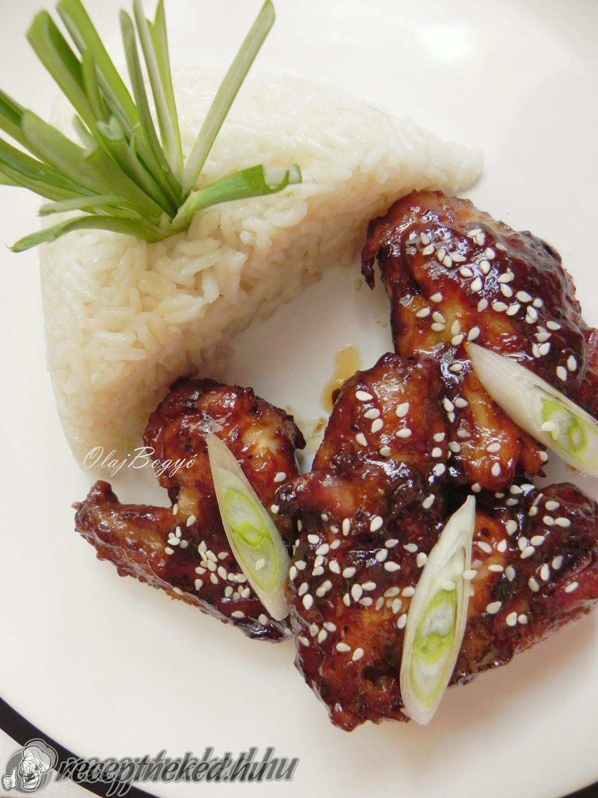 Az ízletes szaft körbe “öleli” a puhára párolódott csirke szárnyakat. Amikor elkészült, azon melegében szezámmaggal és újhagyma szeletekkel díszítjük, párolt rizzsel körítjük.