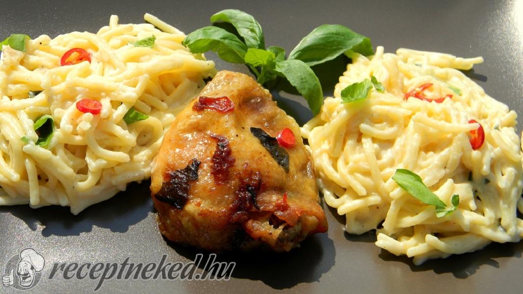 A kifőtt, tésztát beleforgatjuk, megszórjuk friss, felkarikázott chilivel, és nagyobb darabokra tépkedett bazsalikommal. Összeforraljuk, és már tálalhatjuk is a sült csirkecombokkal.