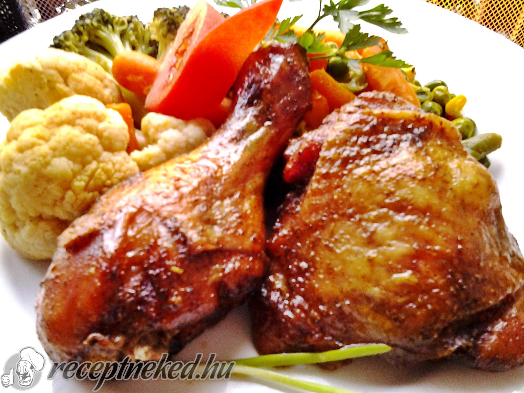 A combokat tepsibe rakjuk, a tepsit lefóliázzuk, és előmelegített sütőben kb. 1 órát sütjük, amíg a hús megpuhul. Levesszük a fóliát, a combokat megkenjük a chilis szójaszósszal és szép pirosra sütjük. Többször ellenőrizzük, mert könnyen megég!