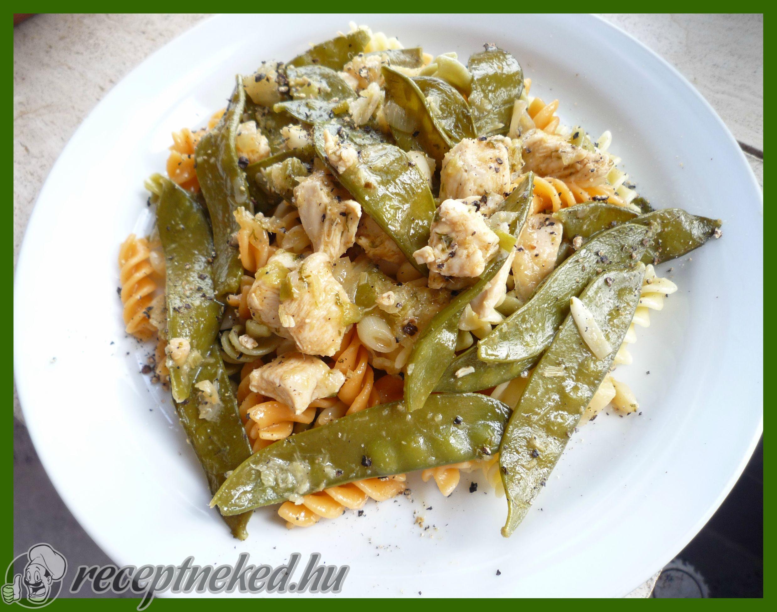 A csirkemellet felkockázom, fűszerezem ételízesítővel, sóval, borssal, citromfűvel és pici pirospaprikával, majd a cukorborsóval együtt a hagymához adom.