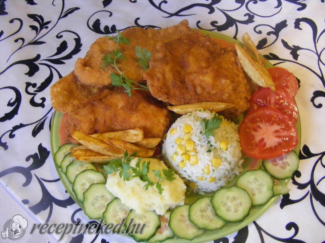 A pulykamellet vékony szeletekre vágjuk, majd óvatosan kiklopfoljuk, hogy egyenletes vastagságú legyen. Mindkét oldalát enyhén megsózzuk.