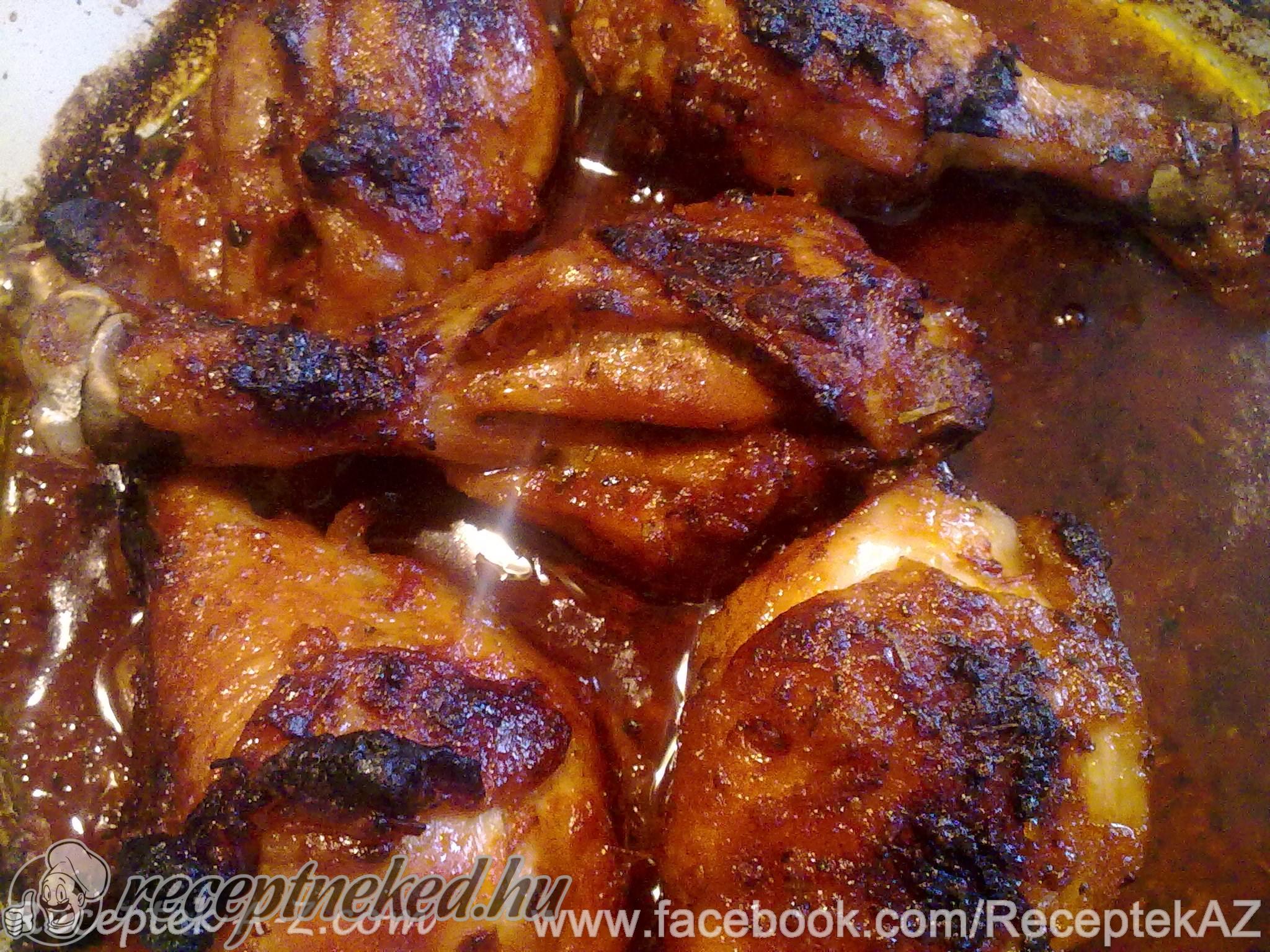 A combokat átmossuk, papírtörlővel szárazra töröljük és egy tepsibe fektetjük őket. A szószt ráöntjük a húsokra és lefedve, előmelegített sütőben 200 fokon kb 55-60 perc alatt megsütjük. A fedőt eltávolítva locsolgatva grillezzük még 10-10 percet mindkét oldalán.
